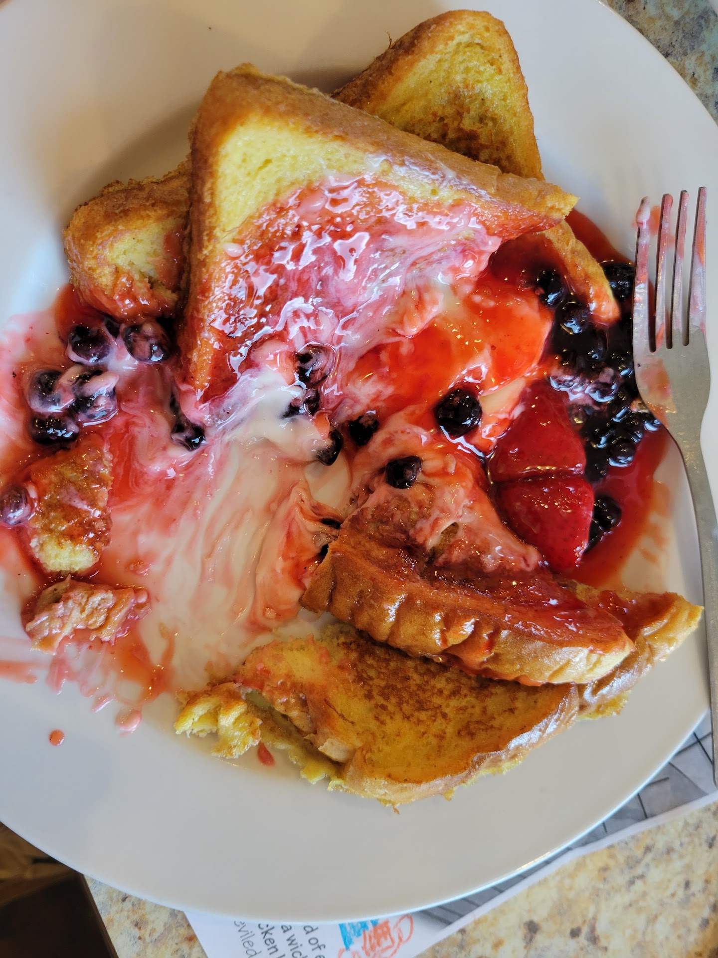 Yes, the food was okay for the price. I ordered the potato pancakes and a denver omelette. The potato pancakes were dissappointing - basically glorified hash browns. (Um not a true potato pancake and an insult to my irish heritage) The denver omelette was a regular run-of-the-mill denver omelette. Nothing extraordinary. My husband ordered the hey rickey omelette and they screwed that up all the way around. The server dropped his toast and used her BARE HAND to pick it up and give it back to us. What?!? Lord help these people get on track and learn proper restaurant etiquette! My husband also ordered the strawberry banana pancakes (his favorite) and they weren't fancy or extraordinary. Just plain pancakes topped with....yup. Strawberry syrup and banana chunks. He is diabetic and lactose intolerant. That should've been mentioned beforehand(oops). I tried giving benefit of the doubt because I too was once a server working 3 jobs to support my family. I get how hard it is in this buisness. But jiminy christmas, y'all can do better then this. I paid $44 for slop I could've done at home for less cost. The point of eating out is to be treated and spoiled once in a while. I did not feel spoiled. I felt like a burden being served by a recovering...