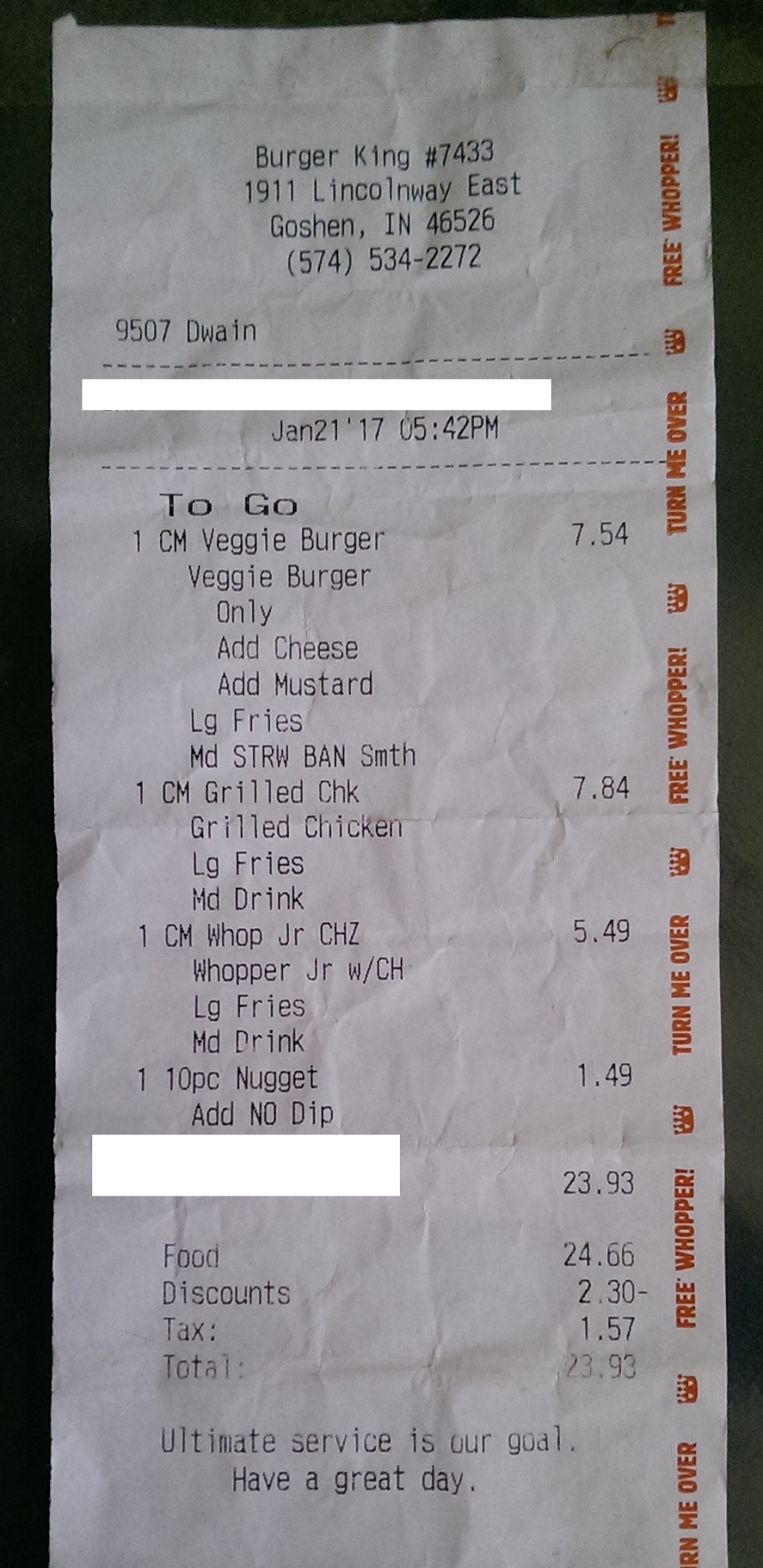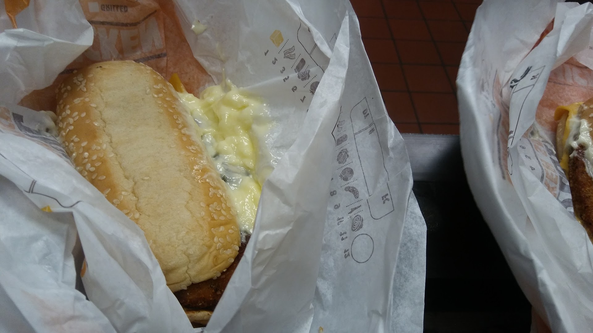 Then came the first sandwich. My dad asked for a veggie burger, and specified that wanted cheese, pickles, lettuce, ketchup, mustard,tomato, onions and NO MAYONNAISE. This is an order that countless Burger Kings all over the state of Indiana have managed to execute flawlessly. Once again, shuffling on that. My dad ordered his stuff, then I got a chance to order my food. I specifically asked for a large sized Grilled Chicken combo with NO MAYONNAISE and let her know that my fries were one of the extra crispy fries my dad asked for.