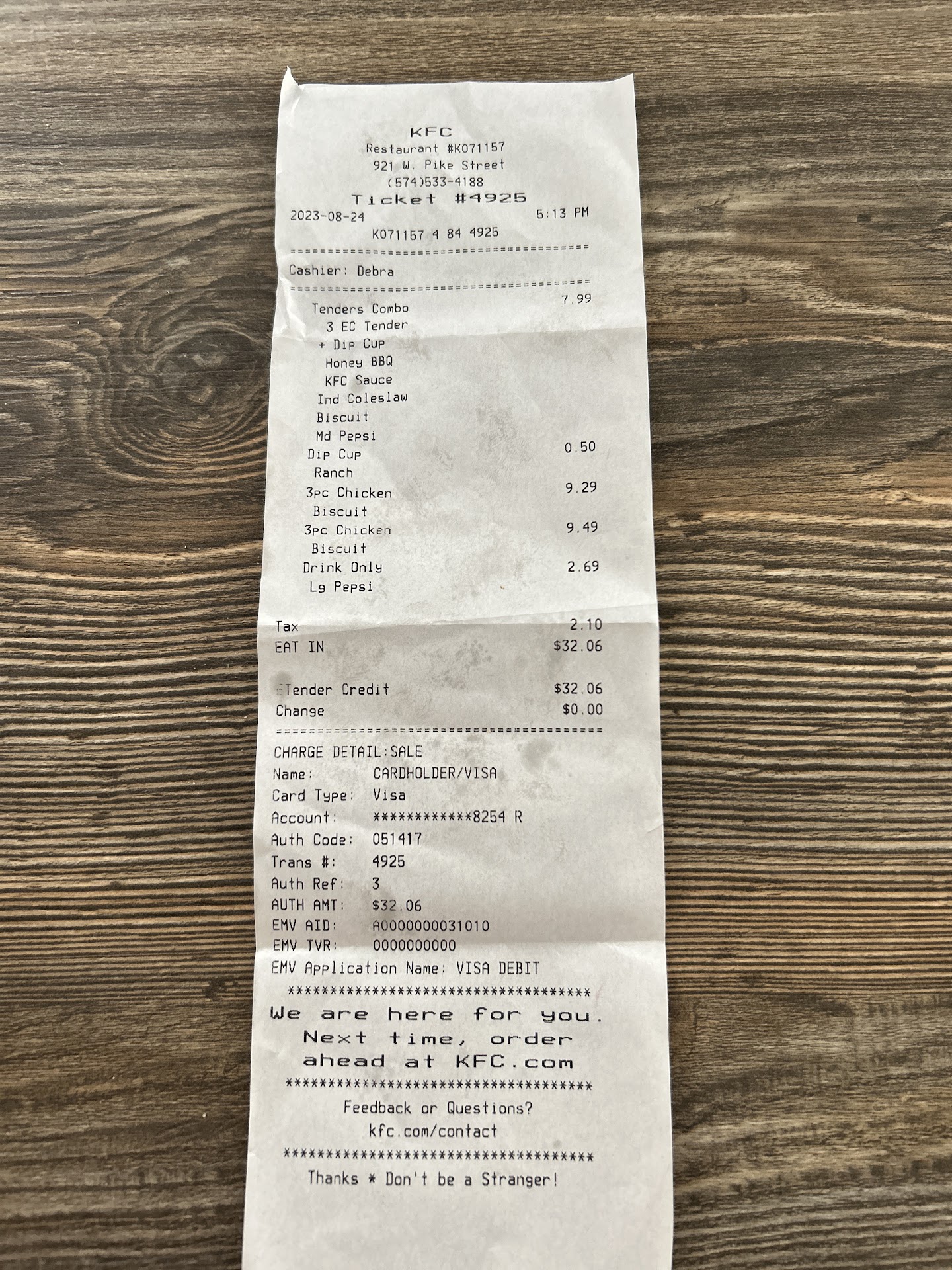 Fast forward to todayās experience. It was after 5:00pm, so I would expect fresh food. The food was warm, but definitely not fresh. It looked like it had been sitting in the warmers since it was made at lunch time. The lady, Debra, who took our order spoke quietly and I misunderstood that she said $32, for our meal. I thought she had said $22. I got a chicken strip meal, for $7.99, and my wife wanted simply 3 legs and 3 wings, ala-carte as it were. The meal came out with 3 sets of biscuits, and it was like 2 basic chicken meals I guess. I questioned it when I found the total charge on the receipt and suggested we had a similar meal in Missouri that was much cheaper. She said she could have rang it up differently, but the price would have been the same. Iām skeptical.