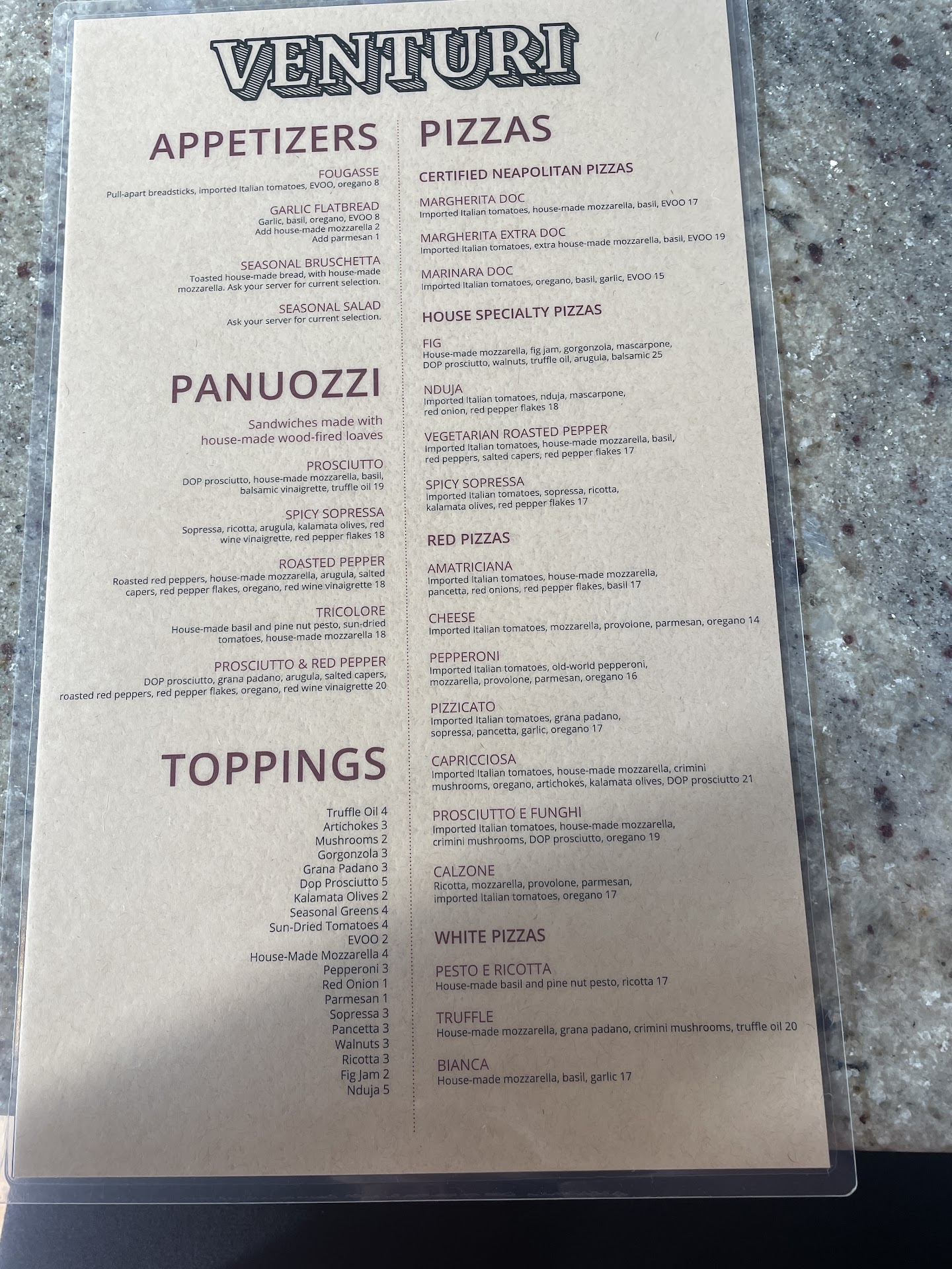 My wife and I have eaten here over the years every so often. We had a date night and decided on... you guessed it - Venturi! We called ahead to see how full they were (knowing they do not accept reservations) and we were informed by a guy on the phone that there was about a 5 minute wait for 2 people. Since we live less than 5 min away, we quickly headed there and informed the employee of our plans. Once we arrived we were greeted by a young gal at the bar and we said a table for two and then she said it was going to be about a 45 minute wait. There was no line when we arrived so I thought that seemed odd. So I mentioned our phone call with the other person. The hostess copped an attitude and sarcastically said something like "well that person didn't check with me first". She was abrupt, not smiling and seemed annoyed by her job - and I'll add that she scarcely made eye contact. Maybe she was having a bad day, but it was NOT what I would expect from a higher quality restaurant. She asked if we wanted to sit outside, well it was raining! My wife and I looked at eachother and decided we didnt want to wait that long. The umbrellas are not sufficient. They don't cover the chairs entirely. I was wet. Perhaps larger umbrellas would make the experience acceptable. We ordered 2 pizzas and my wife and I both ordered one mixed drink. We had 2 slices of bread with tomatoes as an appetizer. (Bruscetta with heirloom tomatoes). 15 minutes later our food was brought to us. This is what really gets me... our bill (after a reasonably sized tip) was $95. Yes the food is good, but to me I feel so unfulfilled walking away from venturi. The quality is great and it seems that they source legitimate ingredients - but personally I feel unbalanced and unsatisfied for the price. Also my pizza (capricciosa) was beyond over salted. I had to box it up because I couldn't finish it. I bet there was 2000mg of sodium in one slice. Overall I felt unsatisfied and disappointed this last visit. However, the food presentation is on-point. So good job with that. If you don't bat an eye spending $100 - $150 for this type of experience, this is a good...