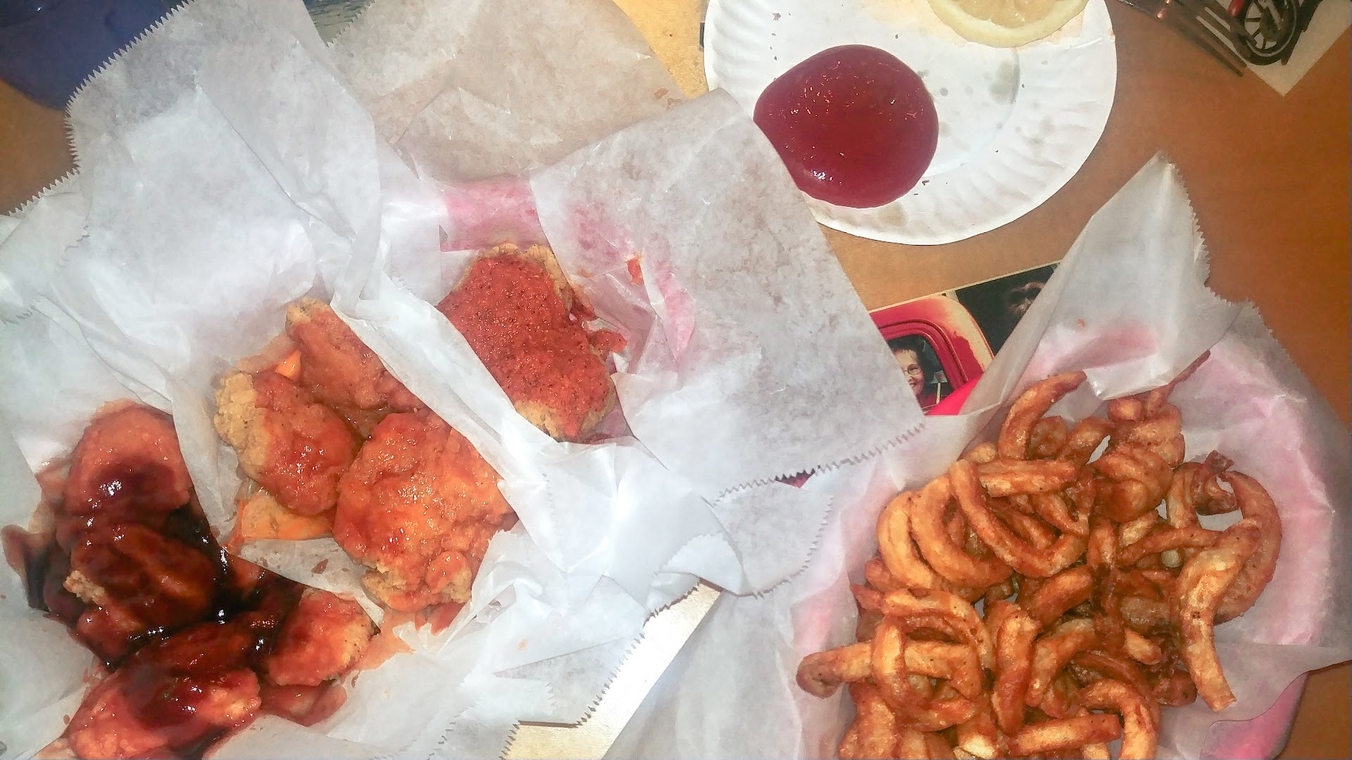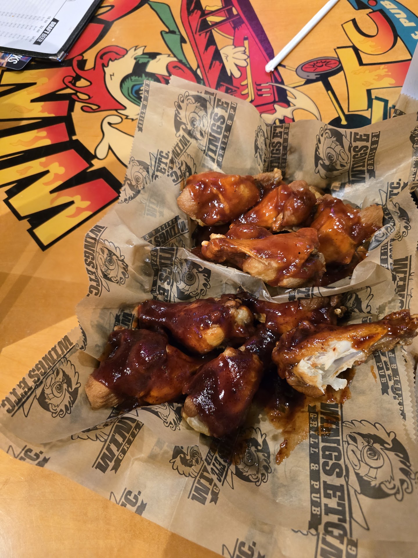 We had a very short visit this time to this Wing's Etc location. We got there at about 9:30 and I told my husband that they were closing soon to go ask and make sure we can order and eat like normal before we get our children out of the car. He went in didn't see anybody at the front so he proceeded to the bar and asked the bartender if we could and she said she didn't see a problem with it. He then came out and told us it was ok so we all went in. My husband, our 2 youngest boys (our almost 5 year old and our 3 year old with autism) and myself. Our 3 year old and me proceeded to the restroom while my husband got us a table. He ordered drinks for himself and the boys and an appetizer for us to share. I got there just in time to order a mountain dew for myself. She left and brought us our drinks and asked if we were ready to order. Before we could answer she started giving us a list of what we couldn't order because it was so close to closing time, any meat over medium cooked couldn't be ordered, we usually get well done but we were willing to order medium because we like the food here. We ordered simple since we did feel bad for being there so late. 2 children's cheeseburgers plain and curly fries, and 2 Stand By Burger's medium with cheese and bacon with curly fries. My husband requested no pickles, even though he's not too picky so if it were to come with a pickle he would have just taken it off well I ordered the same thing, but I am very picky so I politely said "absolutely no pickles for me too please I just can't stand pickles." She then asks me "so not even the pickle spear?" I said "No ma'am" she then starts to walk away and I caught a glimpse of her rolling her eyes and I heard her say under her breath "well okay then" after about 5 minutes she brings the appetizer and the kids begin to enjoy the pretzel sticks with cheese, which I thought was strange because cheese for dipping was one of the things we couldn't order due to it was so late. 10 to 15 minutes go by and she brings out all of our baskets with Burgers and Fries hands my husband our 4 year olds basket tosses our 3 year olds basket at me which I thought ok? Not sure what just happened. Then I thought maybe she's just hoping that I didn't see that I was a waitress for over 5 years so I know mistakes happen. She then proceeds to wait for my husband to turn around from giving our 4 year old his food and she hands my husband his basket then she TOSSES my food infront of me like I'm some kind of animal, personally I don't even feed my dog with such disrespect, and then she looks at my husband said "Enjoy your meal I'll be back soon to check on you" then walks away. My husband and children then start eating their food oblivious to what she just did. A few minutes go by as I sit there in shock that that had just happened and my husband asks me "Aren't you going to eat? It's really good!!" I told him what had just happened and he just sat there confused because she did all of this whole his back was turned or while he was admiring his food. About 5 minutes pass and she comes back to the table to "check" on us and we both just sat there. I don't like confrontation so when she asked a second time if everything was ok I looked away from her and said "we're fine" she must have noticed I didn't even touch my food because she asked me if I needed a to go box. My husband said "we'll take 4 boxes" she responded "ok, I'll get her a box" my husband then said "No, WE will take 4 boxes and the check" she then hurried and brought the boxes and the check, my husband quickly handed her the money, this time he didn't leave a tip. We're not sure what all of that was about but that is NOT how you get a tip and definitely NOT how you treat customers. We ended up leaving a little after 10. After we got home I did end up trying my food at least and it was exactly what I ordered, even down to the no pickle. So the food was great just the service from one person ruined our entire experience. We will definitely NOT be gone back to...