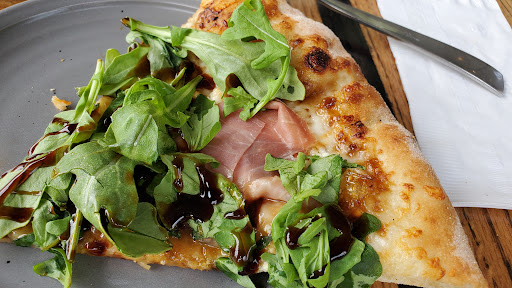 atmosphere is a little dark (a lot of wood), but comfortable and relaxing. a large bar area with tables and a smaller dining area to view the pizza making.