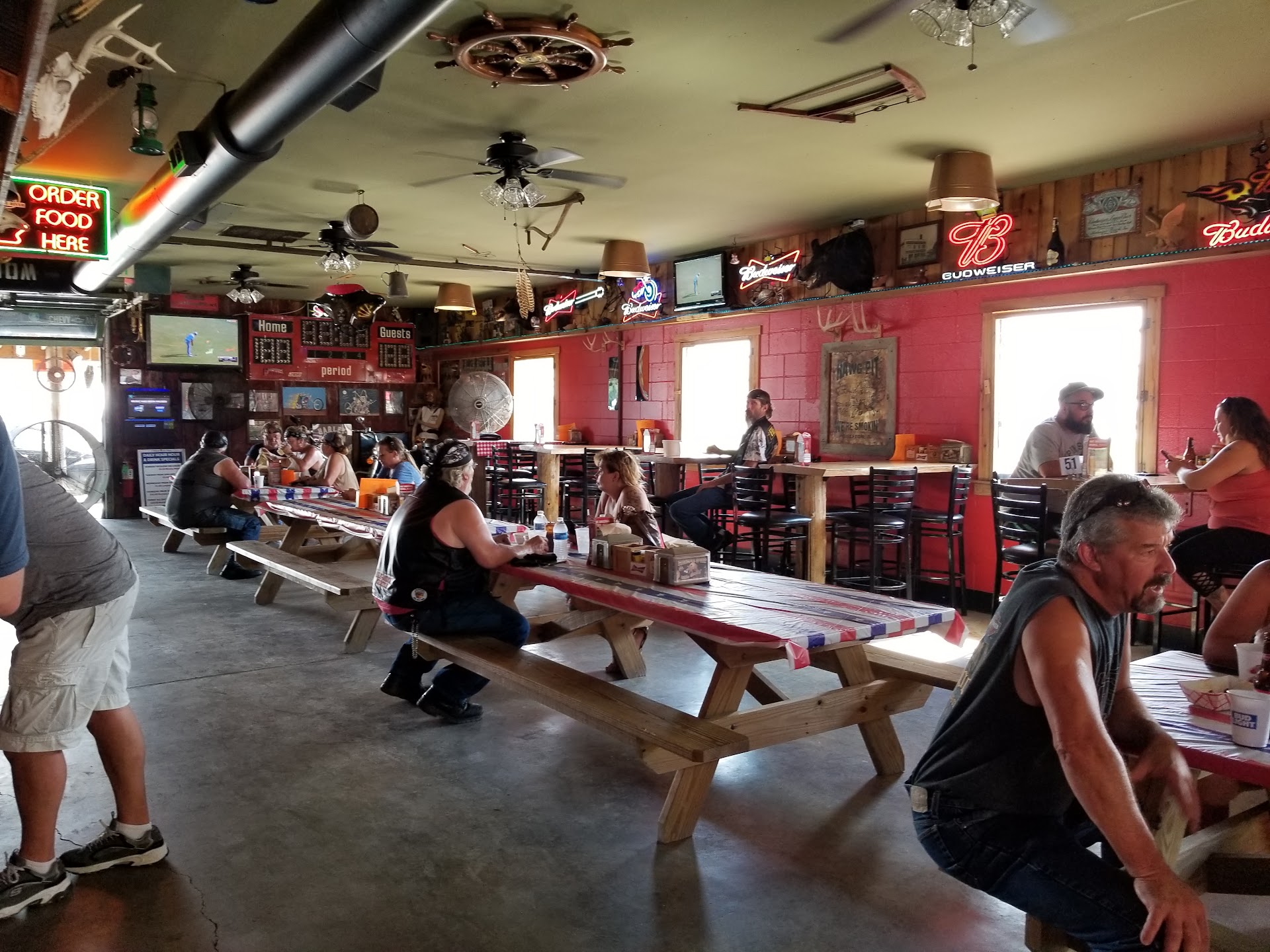 Read moreI didn't eat here, only drank, so no opinion of the food. It was really easy going with bikers and "regular" folk at the wooden picnic tables side-by-side. The bartenders all were quick to fill your drink order and handy with a smile. The day I was there they had a pretty good band. And don't expect the Ritz Carlton -- it's a biker bar: cinder block walls lined with antlers, taxidermied animal heads, beer signs, and for some reason a scythe and a boat wheel on the ceiling (possibly appealing to both the pirate and farmer crowd). There were a couple boss bikes indoor, and the building doors were open wide and fans blowing -- no AC -- and a trike out back. PS no indoor plumbing... two port-a-potties out back. In today's 98 degree heat I told a woman I would give her 20 bucks to go to the bathroom there, and she passed. So ladies, you've...