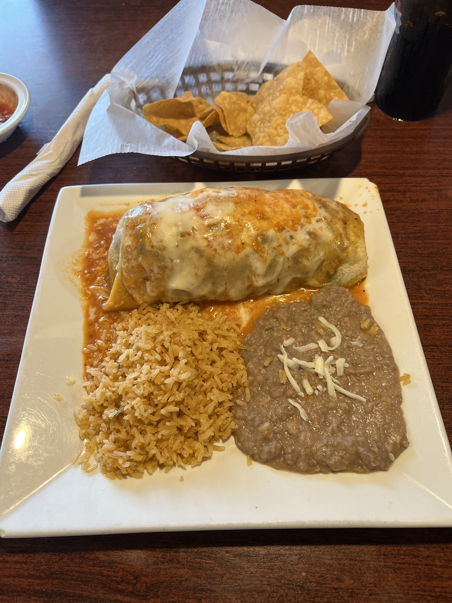 Wasnāt very enthused with the salsa. It had a ācleanerā taste to it. Yuck. Really didnāt have much taste. I tasted more of a soapy taste. Tomato based with very little additives. Chips was awesome tho!!!!! Drink has been good yet the bathroom wasnāt so clean. Piss all over the floor and seat. Kinda dirty if you ask me. As far as the burrito, I shouldāve got a fajita. The burrito was so packed and the tortilla was so soggy, hell I couldnāt even tell it use to be a burrito. Soooo in all reality, Iām eating a plate full of mess. Very poorly prepared. It looked ok when it come out but in order to wait it, itās terrible. Blah. I started to just go to Arbyās for a few roast beef sammiches. I really wish I had now. 1/2 way into my meal and it just aināt no good. Yet itās gonna cost me $20. Just pitiful.