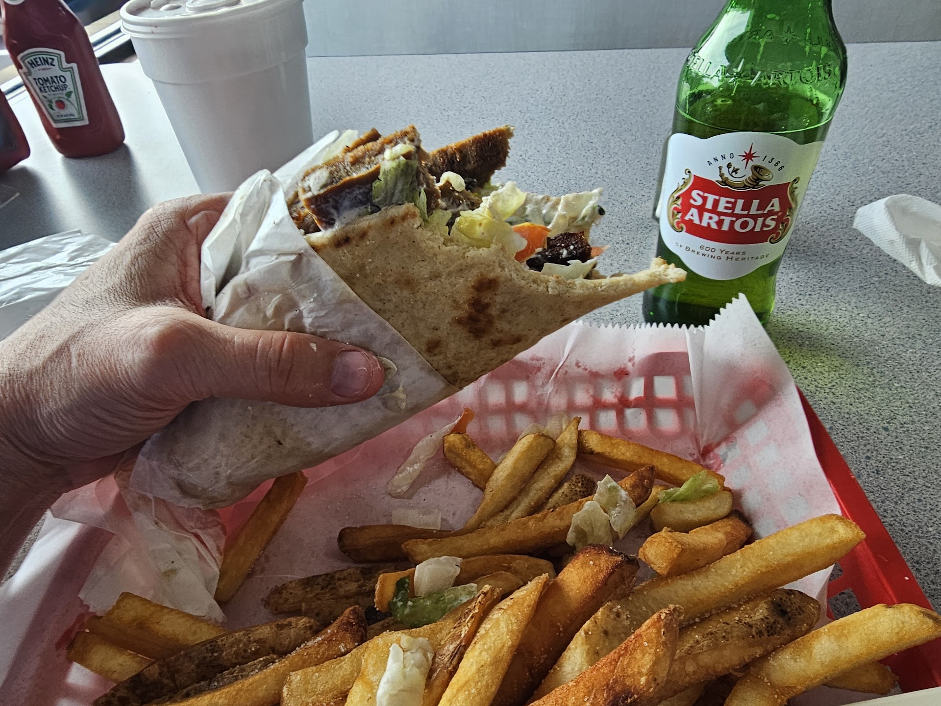 Read moreI LOVE a good gyro! We recently moved to NC and I have been on the hunt to find my new greek place, and the reviews for here got us excited. When you walk in there are multiple different registers, similar to how McDonalds used to be. While waiting in line, there was either a manager or owner walking around, asking if anyone needed anything and saying hi. You could tell he was genuinely interested in making sure everyone was happy. When we went to the register the staff member was super nice and friendly, and asked what I'd have. I'm happy I looked at the menu before hand, because I don't think there was a clear menu to look at unless they had them there and I missed it. I ordered a gyro with no tomato, and 1/2 greek salad and 1/2 fries. My husband just got a gyro with no onion. They give you a number and you pick your own seat. The restaurant was decently clean. We were served our food pretty quickly. The gyro meat was in odd uniform 1/2" thick chunks. Almost like it was frozen pre sliced meat. My husband called them "gyro meat logs". I'm used to the meat being in shavings and usually much thinner. The flavor wasn't all that great either. The different toppings on the pita were not mixed or anything, just layers, and it was hard to get all of the toppings in one bite. They do give you A LOT in the pita though. The tzatziki was our favorite part, and there was not enough of it. The fries were great, which I was not expecting. You could tell they use fresh oil. Unfortunately they were served on a styrofoam plate, with the 1/2 salad, and there wasn't much room to mix the dressing into the salad. The salad was topped with very roughly cut toppings, like a whole ring of green pepper and big chunks of onions. It made it really difficult to not make a mess. Based on our experience, this will NOT be our new gyro place, and I'm still...