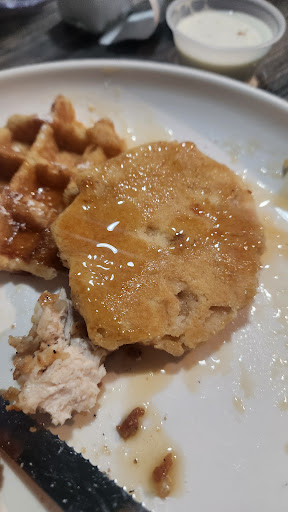 It was a very nice, laid-back kind of place. The food was outstanding 👌. We ordered an appetizer, chips and salsa, and sandwiches. Had to been the best chicken sandwich I've ever had. Everything was fine but the service was so bad it was almost funny. Destiny is young and enthusiastic in her role as a waitress but hasn't learned how to do her job. I would guess emphasis was placed on clearing the tables instead of checking on your tables and seeing what they may need. She never asked if we needed anything but repeatedly came back to our table trying to pick up our appetizer while we were still eating. I felt embarrassed cause I had to keep saying we were still eating on it. At the end we got our tab and my husband was using the restroom and she took our drinks while I am still sitting there..... she quotes, "I'm just trying to clean the table". Ok... people come to eat and relax. Not to get pushed through like cattle. It was like your done now get out. She need to be retrained at her job or the person who trained her needs to be retrained. We will be back because the food was awesome. But please this ruins your meal. Update. We came back. We got another new person. Seems to have a high turnover rate. He didn't know anything. I asked if anything came with the chicken and waffles and he says I don't know I'm new 🤦♀️, maybe go ask? Anyway, I asked for a side of fries. He brought my food, but no fries cause "they don't come with it". But I asked for fries (you know you can upcharge right?) I let him know the waffles were terrible (I couldn't eat them), and he says sorry. No what's wrong with them, how can I make it right or let me go speak to a manager. Nothing. Chicken was good. Won't make the drive again. Customer service screams we don't care about...