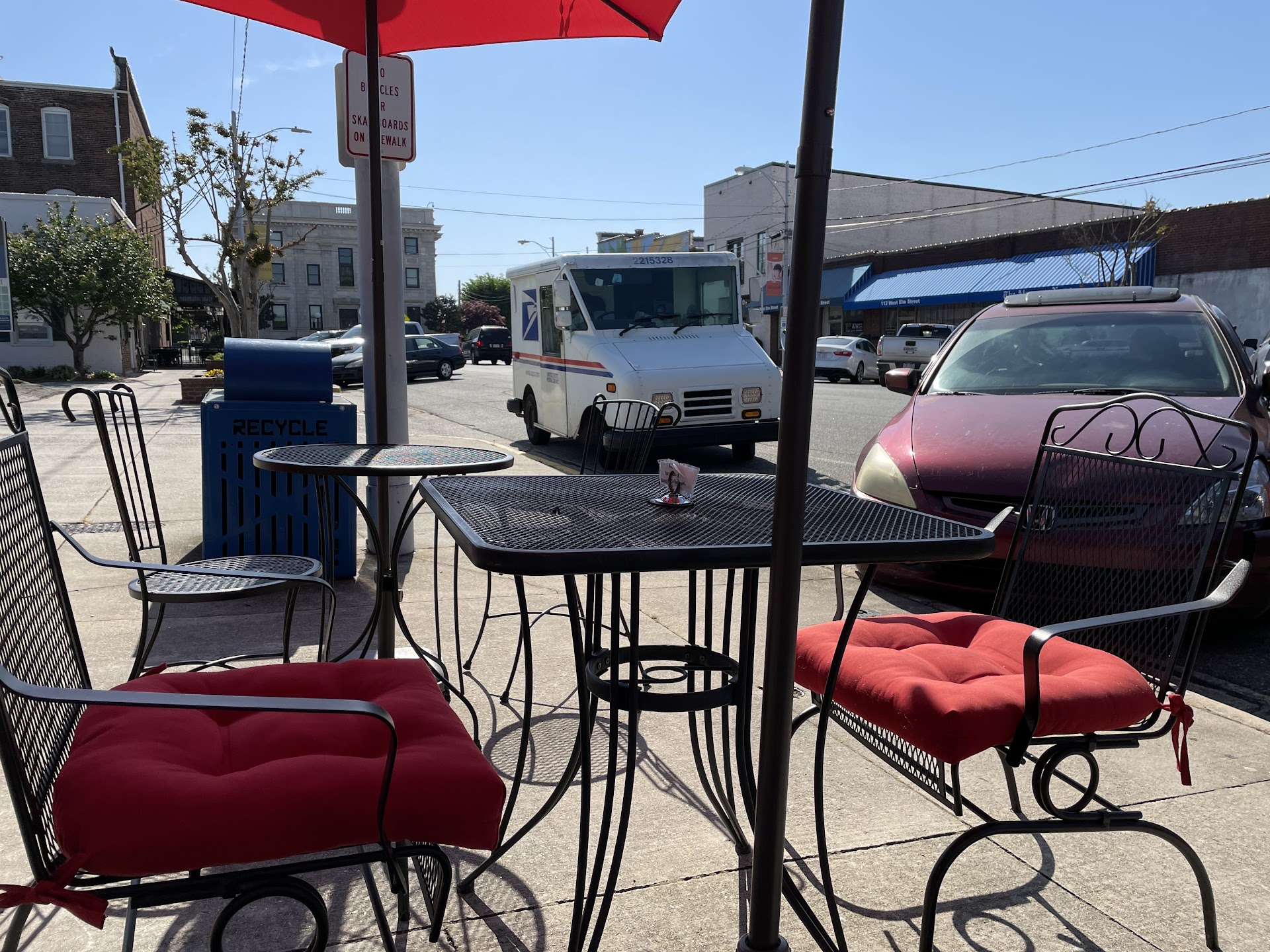 Rose: this coffee shop is absolutely adorable. You can enjoy your coffee outside the shop or inside. The inside is very welcoming, loved the decors and the atmosphere very good. Love the variety of coffee's and lattes. I had the crumb cake with my espresso macchiato which was excellent. The crumb cake was very good and moist. I also loved the variety of coffee mugs and coffee press and few of other things they sell at this shop. The owner was very accommodating and very good at recommending drinks. Overall, my visit was very pleasant and I would love to go back again.