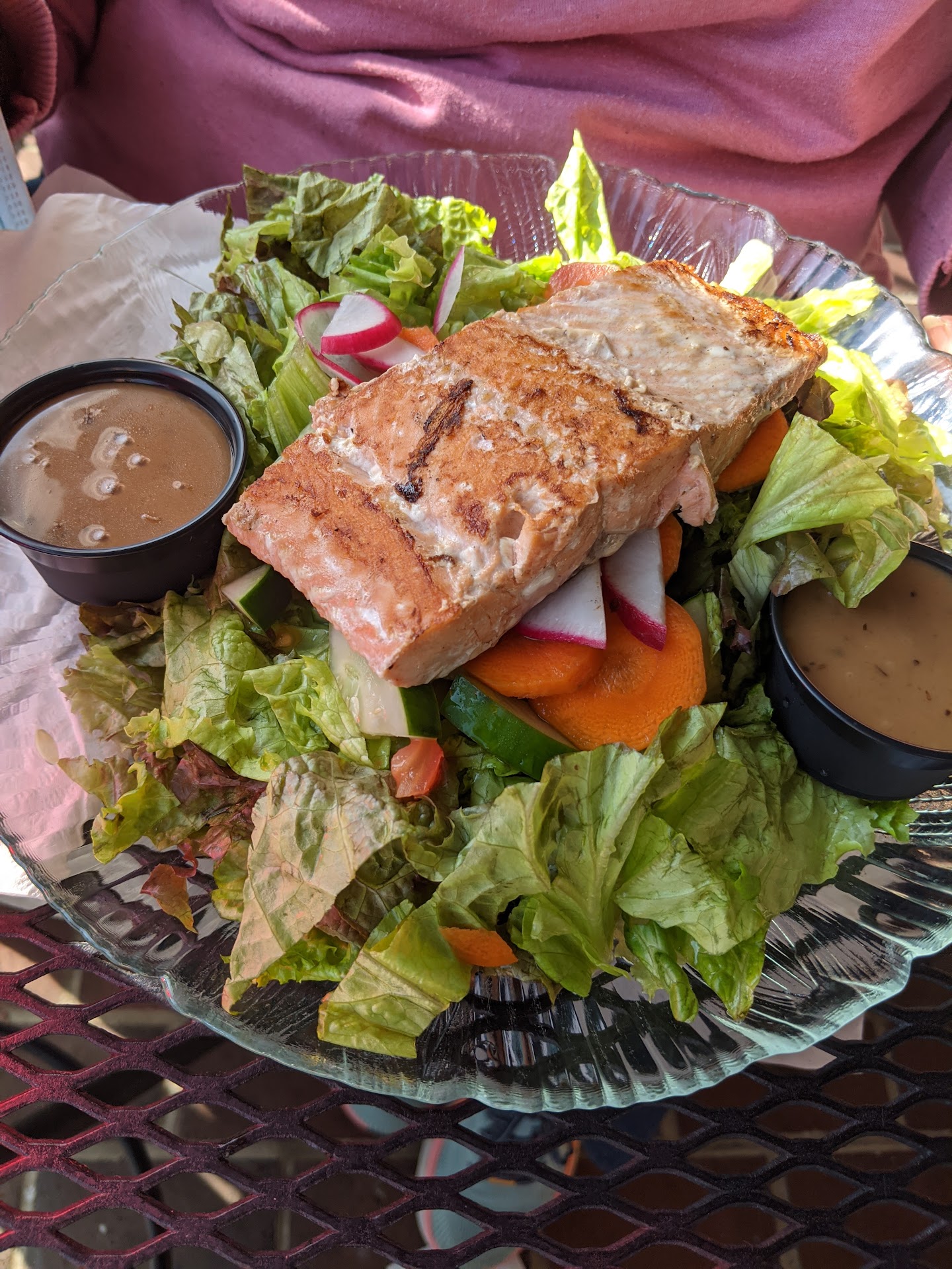 First thing delivered? The salads, Caesar salads. Though they were the house version (given they were substitutes for the fries) the plates were sparser than expected. Next out? Our sandwiches, huh? So my wife went and reminded the waitress about the fried oysters. What is it, as of late, with places not being able to get this serving order correct? The overall lack of caring employees? mumble, mumble....