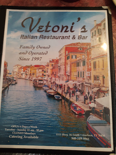 Read moreMy family recently ordered from Vetoni's for takeout. In doing so, My meal was unfortunately left out from the bags that were given to us.