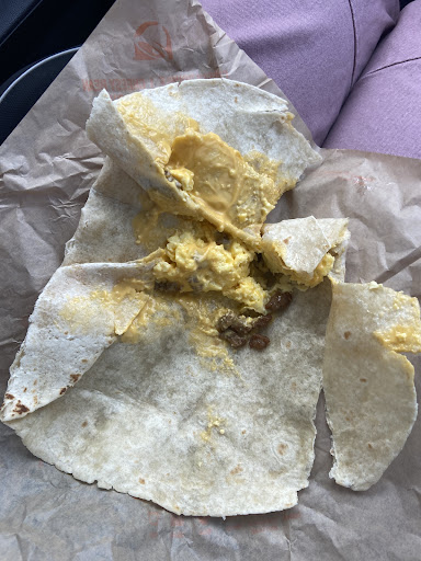 Finally get the food and drive off. Open the “breakfast burrito” and this👇🏻 is what we have. A cheese roll up with a couple sausage pieces thrown in it. The other “burrito” didn’t even have meat.