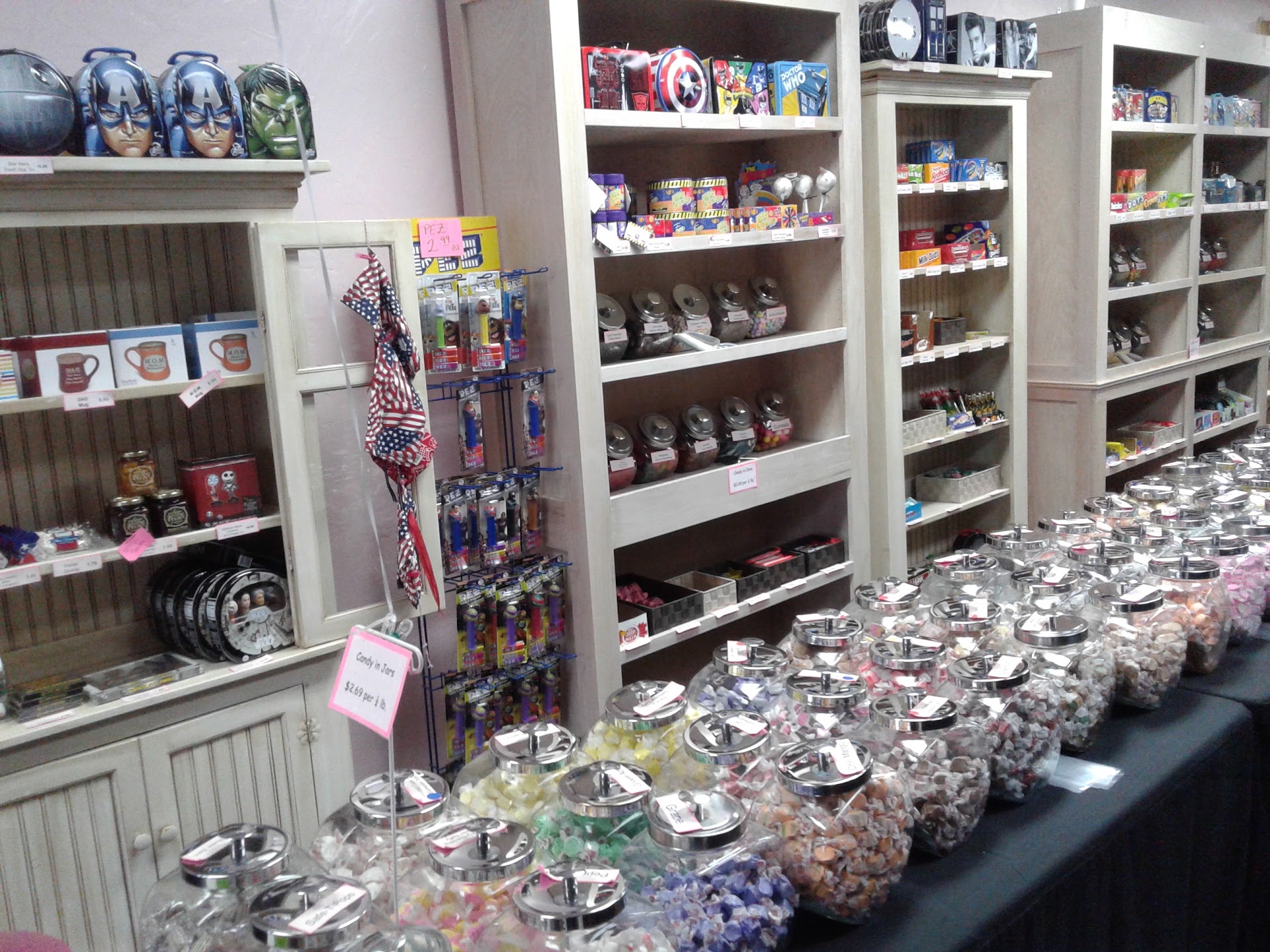 The variety seems endless, especially with the taffey. Buckets, like shopping baskets in a grocery store, are provided to gather a personal stash. Packaged candies of all sorts are also available.