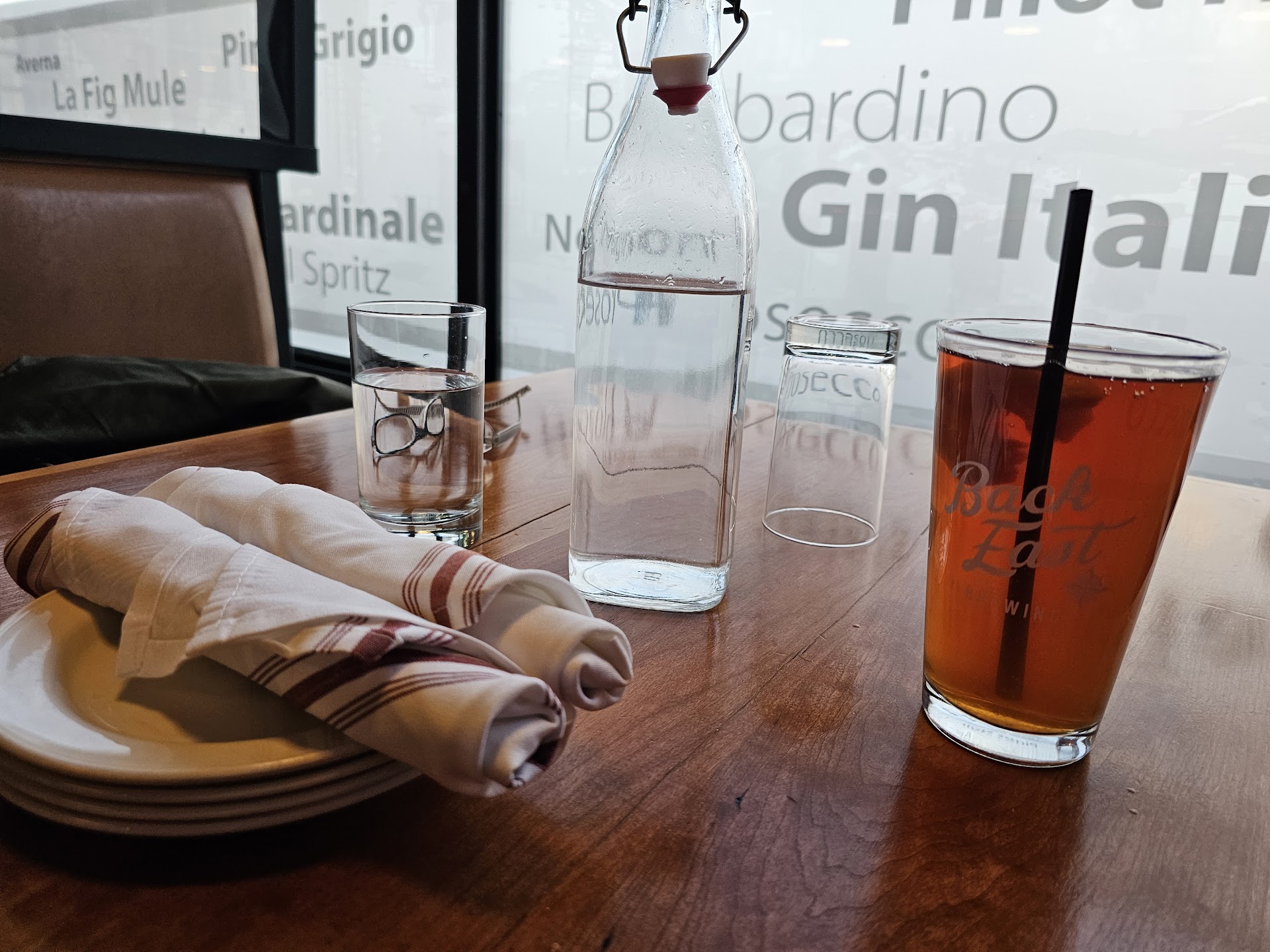 Stopped in as first timers for dinner. We were pleasantly surprised at the range of options from the seafood and braised ribs all the way to the mainstream Italian fare of pizza and grinders. We were seated in the bar area, which was so noisy that we could not hear each other talking, even at half capacity. Our waitress initially showed promise, as she went to the kitchen to inquire about certain allergy foods. We ordered a dinner, a pizza and garlic bread (no cheese). Half hour later, we still didn't have the garlic bread. It finally arrived WITH cheese. The waitress so far had not even looked our way after ordering even to refill drinks, dropped off the plate and quickly disappeared. We were hungry, and considering the wait, we ate it without complaint. Our dinners soon followed, with the pizza being as expected. My husband's dinner however was a very small portion considering the price, and was very spicy/hot. The waitress never came back to check on us or refill drinks, so again, we ate what we could and waited for the check. Check came, with total service time being over 1.5 hours. The waitress gave off an attitude, like she was annoyed and didn't want to be there. It's a shame that with so many higher end options, the service and kitchen time leave so much...