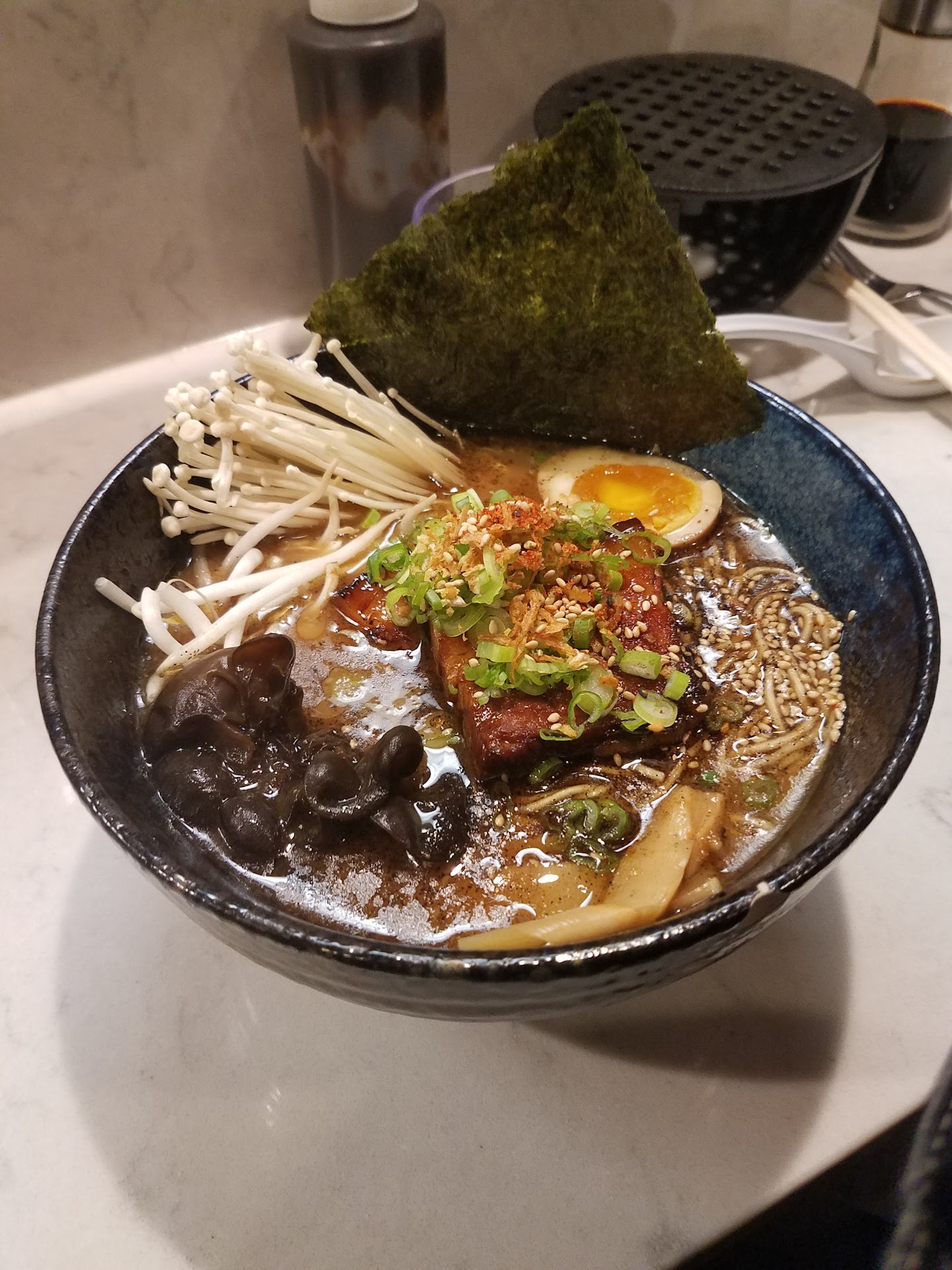My boyfriend, a friend, and I came for dinner at about 7 pm on a Saturday less than 2 weeks ago. It was not busy in the dining room and we were seated right away. The waitress failed to inform us that there was 1 chef working and wait times were extra long. We ordered a little bit of sushi and one entree each - a poke bowl, the “darkness” pork ramen, and the guy’don rice bowl. It took over 45 minutes for the sushi, and the poke bowl came shortly after. My friend ate it so it wouldn’t get cold (and he was also very hungry by this point), and was done eating for at least 10 min before my boyfriend and I’s food came out. The waitress didn’t check up on us during this long wait time and didn’t apologize for the entrees being brought out so far apart. My boyfriend’s ramen had a single piece of pork in it, despite being $16, and it was cold.