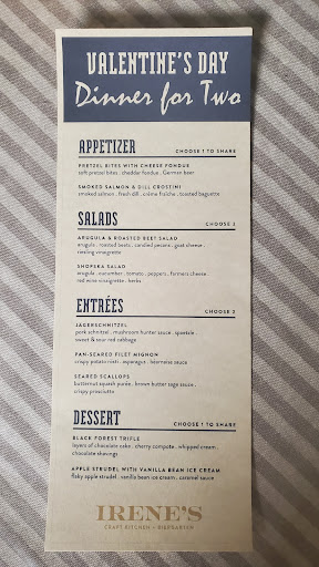Read moreREAD THIS REVIEW This was our first visit to Irene's. We weren't sure what to expect after reading most of the reviews, but we were excited to try Grand Blancs newly anticipated Restaurant, after all we've waited years for a worthy Restaurant to come to Grand Blanc! I made a reservation for Valentines day for Hubby and I. When we walked in I was immediately taken by the aesthetics of this establishment. I found it inviting and welcoming yet classy. The Hostess was friendly and sweet, she initially seated us at a small table for 2 I felt was too small for my comfort so I asked if we could be seated at a larger table by the window and she checked to make sure it wasn't already reserved and we were seated there. It was the only table in kind of a nook and it was very comfortable. Once seated we were greeted by our Server, "Joey" he was very nice, personable and attentive and provided great service throughout our visit. We were given both a special Valentines menu and the option of their regular menu. We chose the Valentines menu. We ordered the "Smoked Salmon and Dill Crostini appetizer,, and while the description stated, "fresh dill" we did not have any dill on ours but instead "capers" however it was still excellent! We both choose the "Shopska" Salad and again excellent! For our Entrées we both choose "Seared Scallops" the description states "butternut squash puree & brown butter sage sauce with crispy prosciutto" let me TELL you, this dish was OUTSTANDING! Hubby and I could not stop yumming from the first bite to the last! The flavor profile melded each component in this dish PERFECTLY! Finally we finished with the desert "Black Forest Trifle" that we shared. It was dark and rich in flavor but the cake component of this desert was a bit dry but still tasty and a nice finish to the previous 3 courses. I learned that the items offered on the Valentines menu are not offered on their regular menu which was a major disappointment, because Hubby and I agreed we would come back again and again for that Scallops Entrée! The Owner, Eric came by our table and I was happy to suggest he consider the Scallops Entrée as a regular feature on his menu, what a great seafood offering this dish would be! It was a pleasure speaking with Eric, he was genuinely interested in his customers feedback and I was impressed by his presence, pride in his appearance, a well dressed man with appropriate looking attire for the owner of a very nice Restaurant. Equally, our Server Joey was nicely dressed and took pride in his appearance as well. Very refreshing to see as pride in one's appearance is a long fading virtue" Joey provided us with great service, perfectly timing each course. The only real critique I had was for being Valentines day, the restaurant lacked any Valentines decor" it would have been a perfect touch to add some tasteful decor for the occasion and perhaps a rose for the Ladies as they entered the restaurant" I also mentioned this to Eric the owner and he graciously agreed" I am thankful to Eric and his family for bringing this beautiful Restaurant to...