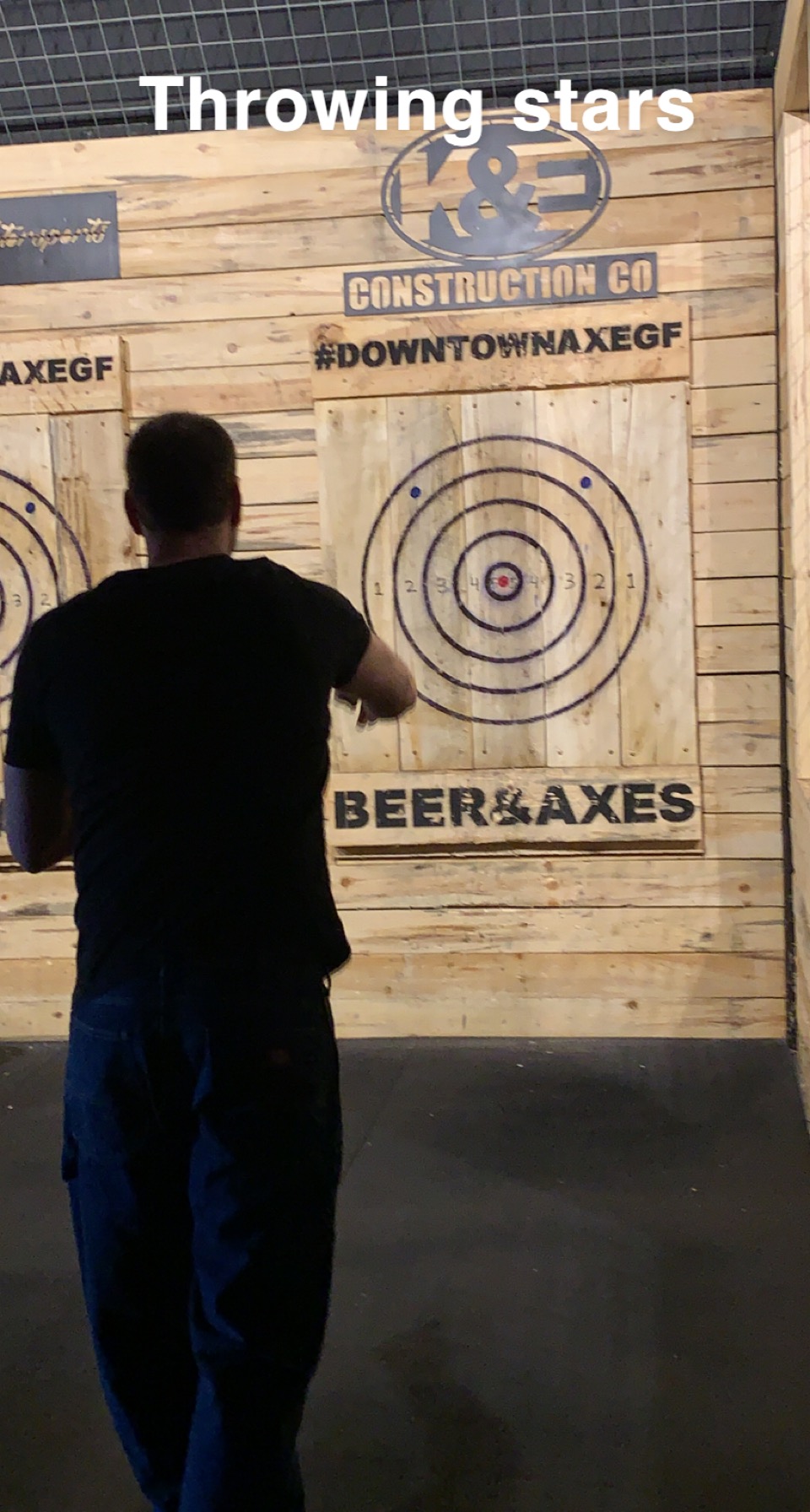 Birthday fun! Four of us went for 2 hours and it was a perfect amount of time. We all agreed that by 1 hour we were just really getting into it, especially since it was all of our first time. Staff did great showing us how to throw and explaining rules. They were also great at checking on us. It’s easy and fun to connect with the groups next to you. Everyone is supportive and encouraging. FYI no hard liquor and pay attention the axe can bounce back towards you if it doesn’t stick in the board. Also you can get a throwing star to use too. This was also very fun and definitely has a different...