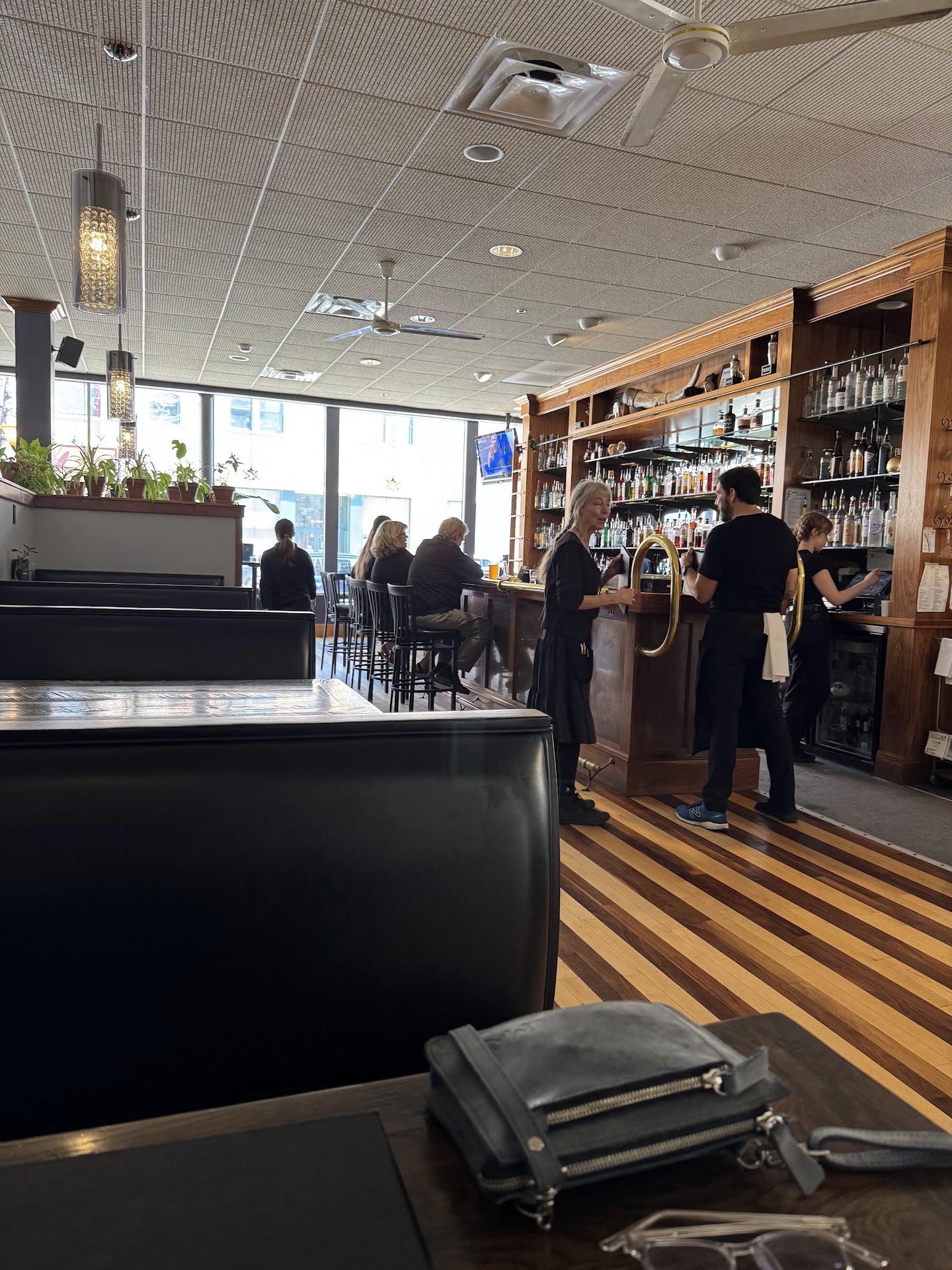 My experience while dining here was downward slope that kept declining faster the longer it dragged on. We waited at the front desk for about 6 minutes before a server noticed us and get us seated. And then, upon listing the specials of the day couldn't tell me what all came in the soup and had to go check. Which isn't a big problem at the time as it was one item that she didn't know. She did offer to bring me a sample of the soup, which I can appreciate and was a nice gesture, and the soup was good. We then ordered and I got the BBQ brisket sandwich and the soup, while my girlfriend got the fried oyster and the steak and fries. When my sandwich finally came out I was surprised because it was honestly bland. With how little was on the sandwich, I could've eaten the brisket on its own and the taste would've been the same. What really made me realize how the quality was dropping as the meal went on was actually the fries, which were hashbrowns shaped into sticks that were overcooked on the outside and mushy on the inside while being way too fatty. Upon trying them with the steak sauce I spit it back onto my plate because of said sauce. The sauce was sweet in an off way that made it taste like a barbecue flavored jelly bean to me and my girlfriend said it tasted like black licorice. Upon finishing the parts of dinner we could tolerate, we got desert at my girlfriends insistence. The waitress had a list with the deserts on them, but upon asking the price she had to go check. She had a dessert menu without prices, and thats what gives me an impression of this restaurant being a drunk trap on top of everything else. With the quality of the meal degrading as time went on, the grainy dry cheesecake, and the waitresses lack of knowledge on several food products or their prices was really making it seem like by the end of the meal you were supposed to be inebriated enough to not care. Neither me or my girlfriend...