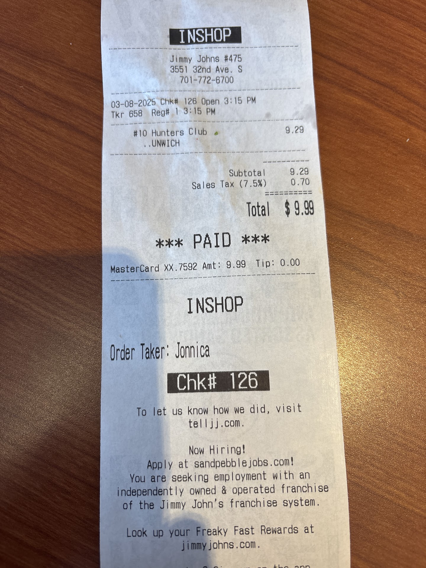 Read moreWent to Jimmy John’s on 01/31/2025 at 5:30pm and walked in to place an order. There was only two people working and eventually third employee showed up after 15-20 minutes of waiting. We ordered one sandwich and a wrap. After waiting for around approximately 30 minutes, one of the employees said they ran out of French bread. After 5 minutes we asked the status of our order. One of the employees said our order must of been taken by someone else and they would make it up right away to fulfill our order. They came back and said the sandwich would take an hour for French bread or we could do wheat. We decided since we were on a timeline for traveling we decided to do wheat bread for our sandwich and the wrap. In total, we spend around 35-40 minutes to wait. I want to bring this to the attention during the busy rush on a Friday and running out of bread and backlog on orders. Hopefully it was just a one time mistake on their part. Management should look into some contingency planning on...