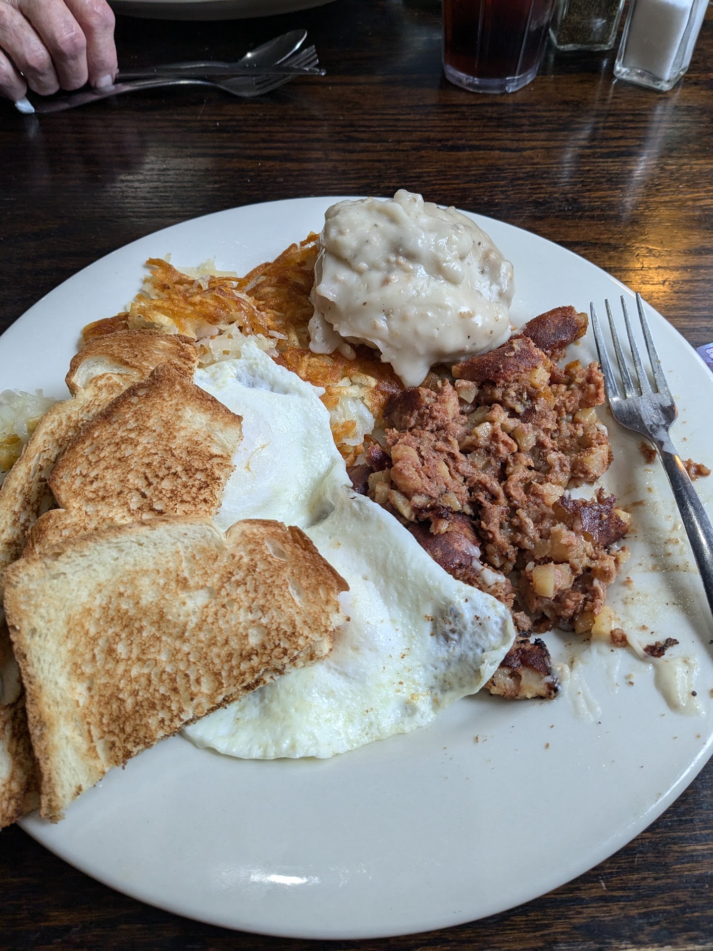 Read moreLong wait for a table even though they were not very busy. 15 minutes with many open tables in sight. Staff seemed disinterested. 8 minutes at the table before getting service. Finally got coffee and it's very weak, no flavor. Food arrived and it got way worse from there. Food arrived 20 minutes after ordering. Skillet was very small and the toast was burnt. I ordered a sausage gravy Skillet minus the cheese which I thought would be eggs hash browns bacon and ham covered with sausage gravy which is one of my favorites. What arrived was a very small Skillet with hash browns with a few bits of bacon and ham with some sausage gravy over the top to my surprise no eggs. When I asked the server if this came with eggs I got a very terse you should have ordered the number 16. I will never eat at this place again. If I could give a zero...