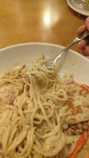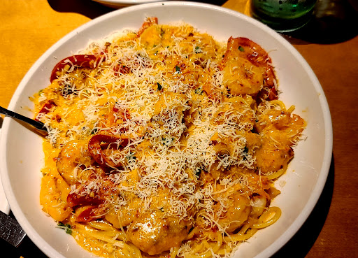 Read moreMy first time at an Olive Garden. I'll admit, I consider this the type of chain restaurant that I'm not typically in favor of dining at due to the perception of "cafeteria style" food and interior layout. It is a bit stereotypical of that in terms of the amt of tables. This type of restaurant provides for service to many diners at a time creating the potential for a less than personalized dining experience and food not prepared for each person but for rooms full of diners. Interestingly though, I REALLY enjoyed the shrimp linguine and salad. My daughter and I split each item and Lucas, our waiter, pre split the plates. I love how the salad comes in a large serving bowl. It's mainly ice berg lettuce but it's pre tossed with a decent, light and simple dressing. Fresh Romano cheese is ground for you at the table if you desire. The shrimp was cooked to perfection. Shrimp is so typically over cooked, it was nice to see it still translucent and tender. They weren't baby shrimp but much smaller than average. That didn't matter bec they were delicious. Lucas offered us four wines to sample prior to ordering a bottle. We told him we wanted a red blend and he brought four options. He poured up four generous tastings for each of us in four separate wine glasses each. By the time we decided, I had drunk enough to feel like splurging on a bottle. (Great way to upsell, Lucas!) The pay-at-the-table credit card machine seems a bit tacky, and it takes up space on the table, but it certainly does allow for unlimited time to review the bill when paying, and also an easy way to select the tip amount. I hope management reads my review to see that our waiter, Lucas was TOP NOTCH! He was friendly, knowledgeable with the food and wine and allowed us a personalized, non-rushed, and over all very pleasant meal and dining experience! Great work, Lucas!! Even though I am from CA and will most likely never be back to this particular Olive Garden, I will definitely consider dining at one in...