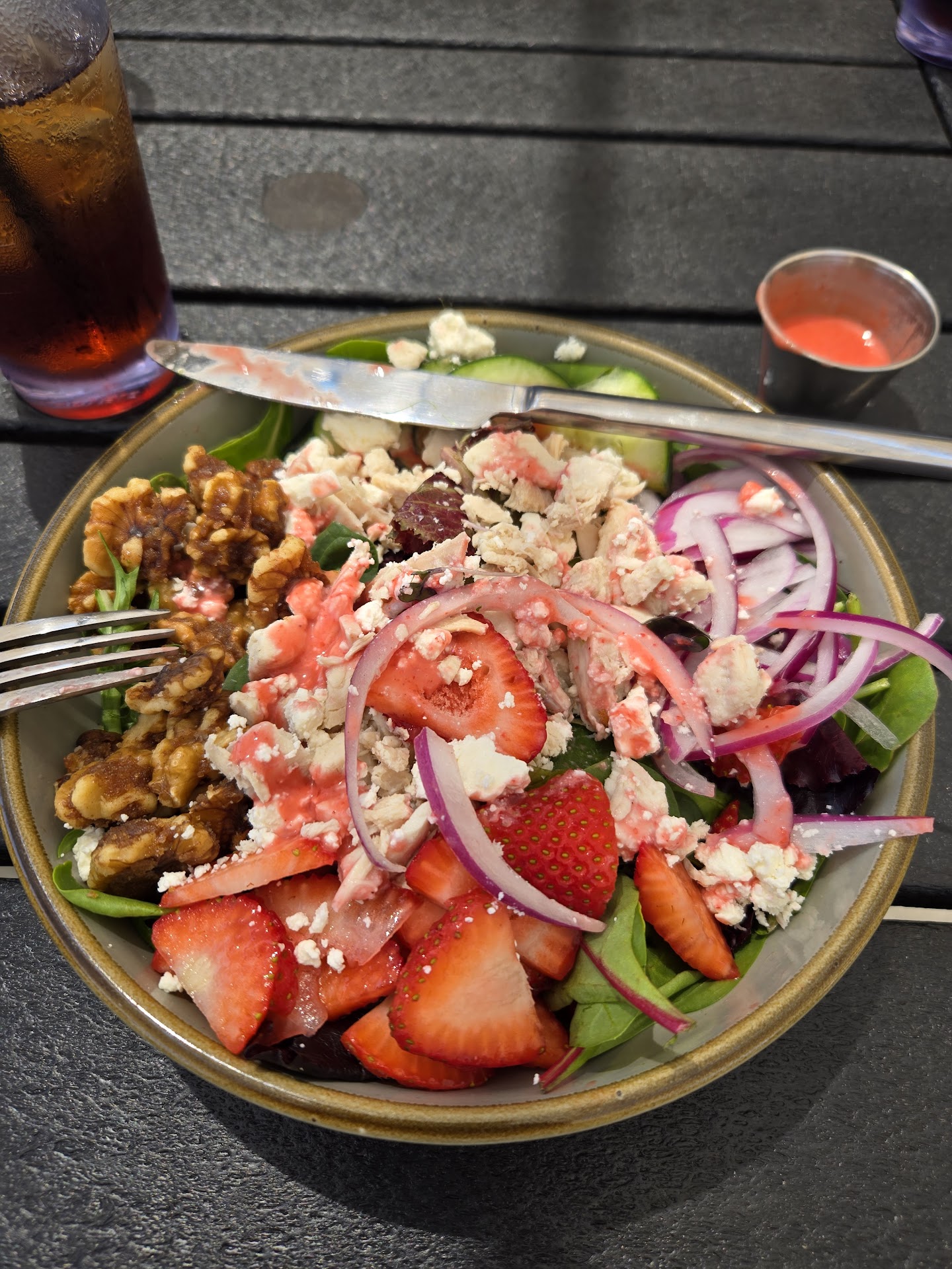 Ā Ā Ā Read moreMy salad was just OK today. The menu (screen capture from their site attached) offered a Strawberry Feta salad, and I added the grilled chicken also listed on the menu. My friend and I were not initially in a hurry, but his wife called to say she was done shopping right after my salad was delivered. After a few bites of the salad (pictured), I got to the chicken below the feta, only to discover it was both cold and clearly not grilled. It rendered the entire salad average at best, compared to the dozens of very similar salads I've had all over the country since being more careful with my diet in the past 15 years.