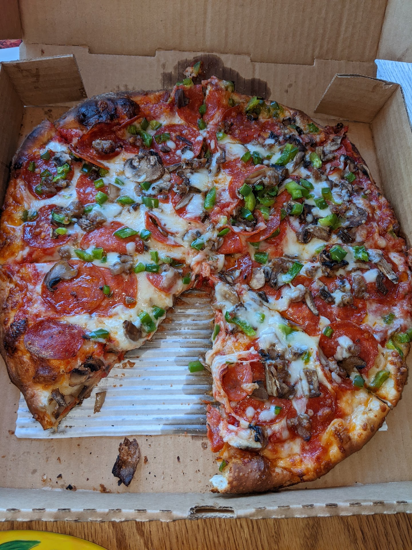 Read moreWe're always looking for the perfect pizza and our search brought us to Topshelf. So we ordered our usual deluxe. Now, I get it that pizza lovers have varying tastes so this is only my impression. We were told 20 mins and it was right on 20 mins. Opening the box for the big reveal found an excellent looking pie. Toppings were plentiful and well distributed.. good quality toppings at that. Here's where personal tastes come in. The crust had the appearance of a good ol' homemade crust with what I call a delicious "char" on the edges. My wife's term is "burnt" and wasn't as appealing to her. One thing we did agree on was the sauce. It initially tasted like made from fresh tomatoes.. just with no salt. Actually would have been a huge improvement with a bit of salt, oregano, and pepper. We did noticed that the next day leftovers had improved the flavor of the sauce after marrying the flavors of the pepperoni and sausage. For us, a slight tweak and it could be a...