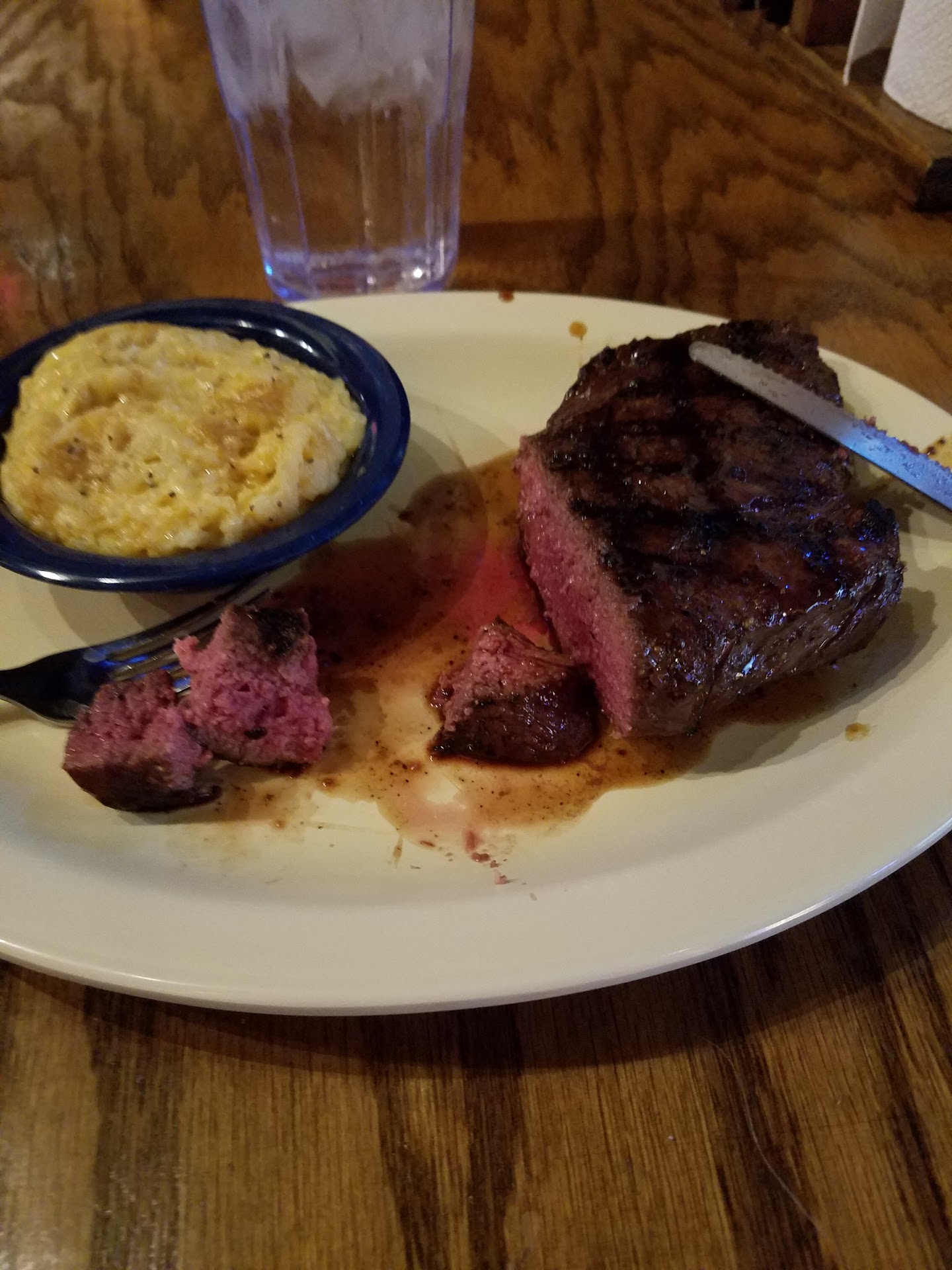 Ordered the jack steak. Which my customer recommended the steak or ribs. And it is great. Perfect medium rare. Great flavor. Hasbrown casserole is good. The salad was huge. Server is super nice. Hasnt let my water get less than half full. Great place!