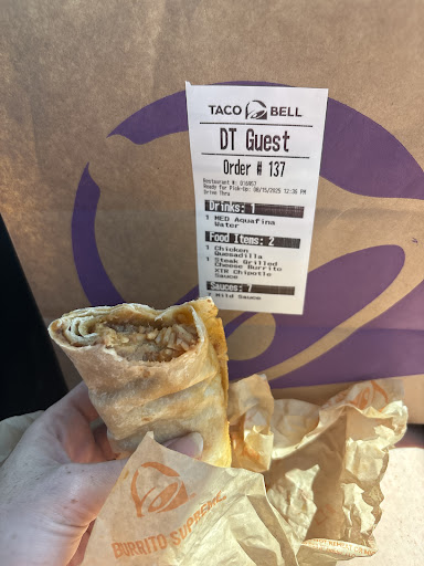 Read moreWent through drive through and ordered a chicken quesadilla, water bottle, and grilled cheese steak burrito with xtra chipotle. First they said they didn’t even know if they had water. Guess that should have been the first red flag. Got the chicken quesadilla and there was only chicken and chipotle sauce on it and there was only filling in the center two pieces empty tortilla on the ends on both sides. Opened my burrito and it was just a bean,rice and cheese burrito with chipotle sauce on it. Made absolutely no sense. No steak, no grilled cheese. Price difference alone made me upset when a bean burrito is maybe 3$ and my burrito was probably about 9$. It wasn’t busy either so just feel like this should have been something that shouldn’t have been messed up. We couldn’t turn back as we had checked and saw a burrito and quesadilla in the bag so headed off towards the interstate. All I can say is we probably won’t ever return to this Taco Bell. If you can mess up when it isn’t busy I can’t imagine how their...