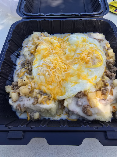 My wife and I stopped here because we like biscuits and we were not disappointed. She got the Chicken bacon maple butter biscuit. You will need to wash your hands when you are done with it. Two large chicken tenders, plenty of bacon for some in every bite, sandwiched in a large sliced biscuit with maple syrup you pour on to control what you get. The tenders are worth getting by themselves. My wife took one off the sandwich to make it more manageable to eat and shared that one with me and it was tender, juicy, and a nice light flavorful breading. I had the Over The Top with sausage and over easy eggs. Two spit biscuits with sausage gravy, potatoes and eggs. Thankfully they had hot sauce if you want it, because for me b&g requires it. The gravy was creamy and delicious, eggs cooked just right. Overall very good experience and we will be back. The service was great and the young lady that helped us is the daughter of the owner. Go...