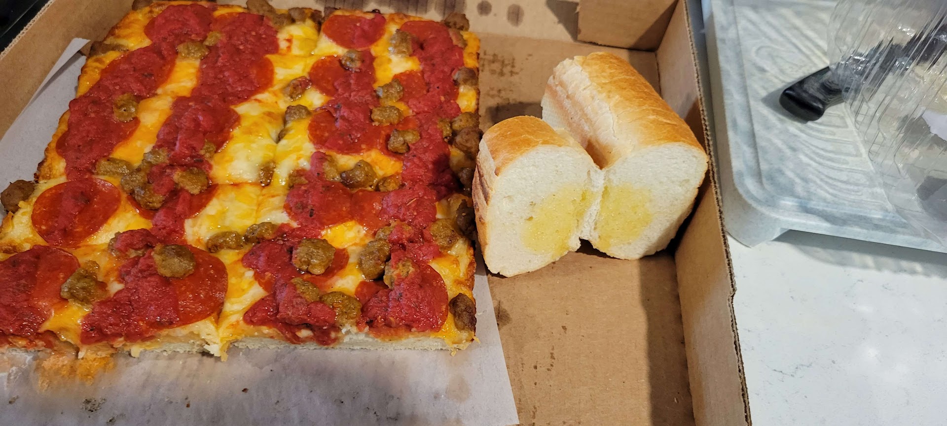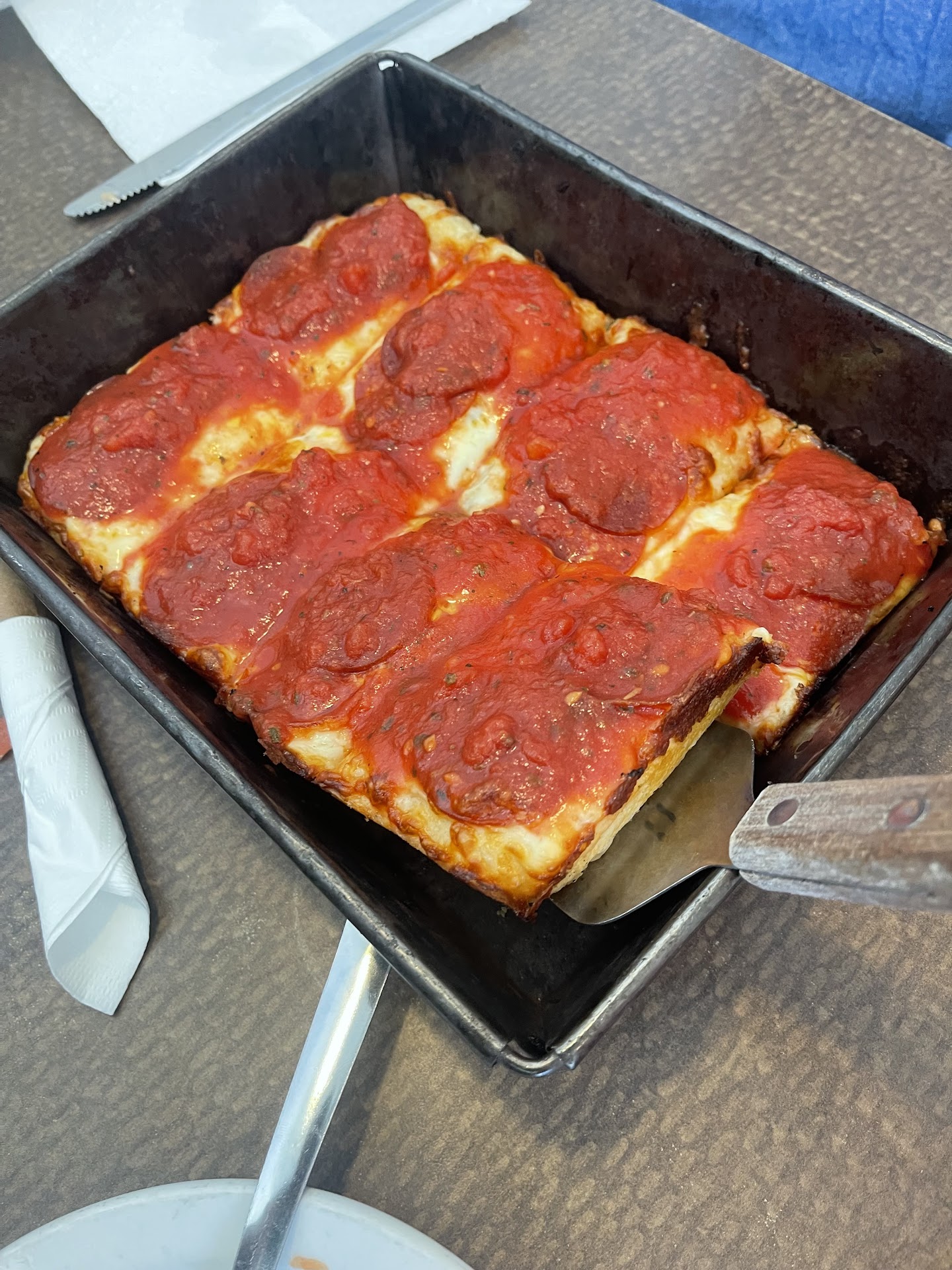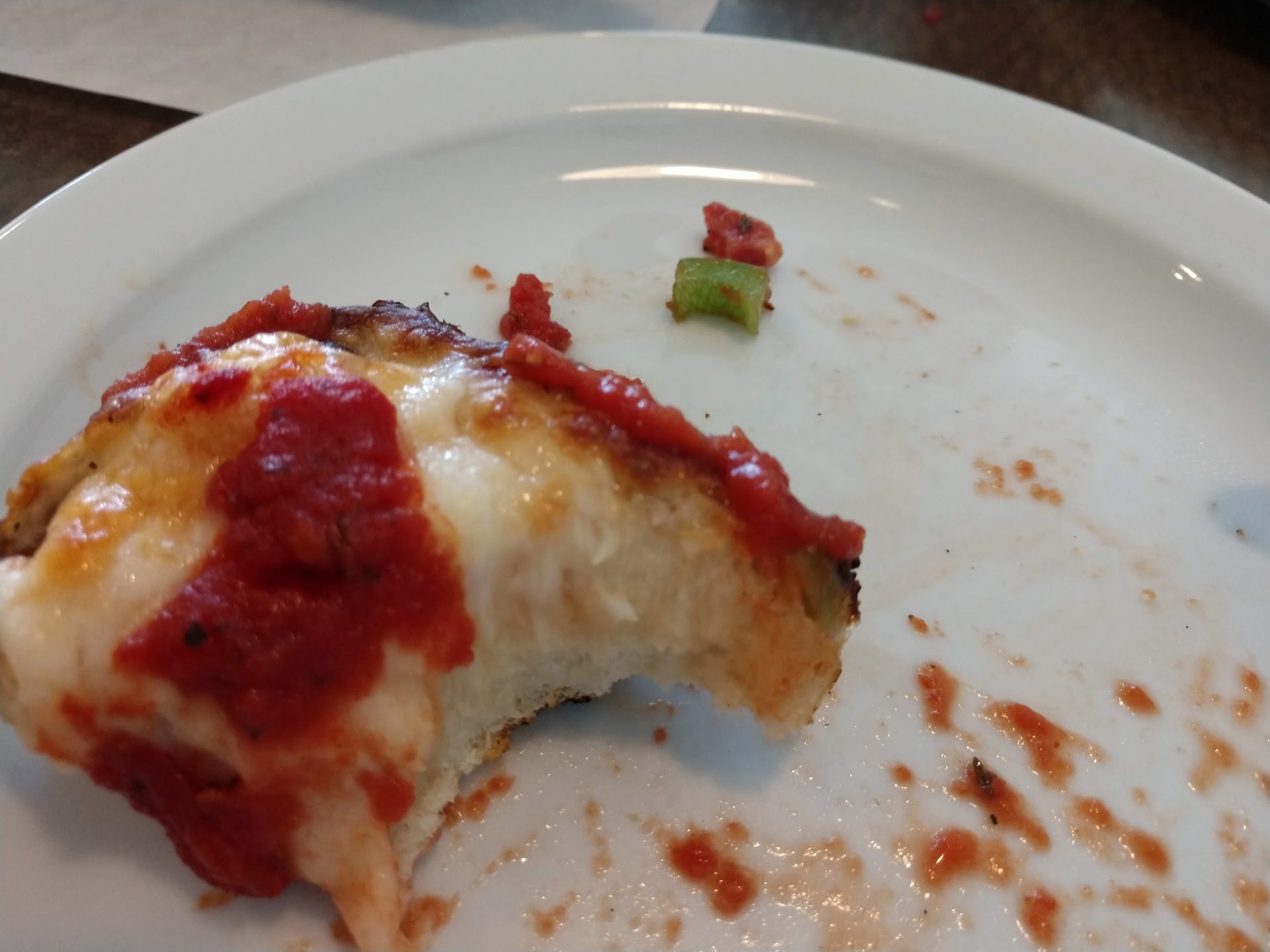 Read moreArrived about 6 and only a couple tables had customers so we were greeted promptly. We thought we wanted to order an antipasto salad but it turned out that it was finely chopped tomatoes and Ham and that is really not an antipasto salad. We passed on that and ordered a mini salad which was very mini and over $6. We ordered the deep dish pizza with green pepper, olives, onions, and salami. Each topping was $1.50. we had a hard time finding the salami and all of the toppings were so finally chopped that they barely had any flavor. The sauce on the pizza was delicious but unfortunately the toppings were sparse. This pizza had really good potential but was disappointing with the lack of toppings. Picture shows a piece of green pepper and believe it or not a piece of salami. The pizza would have been great, the bottom was crispy and as I said the sauce was wonderful. Wish there would have been bigger pieces of toppings so we could have...