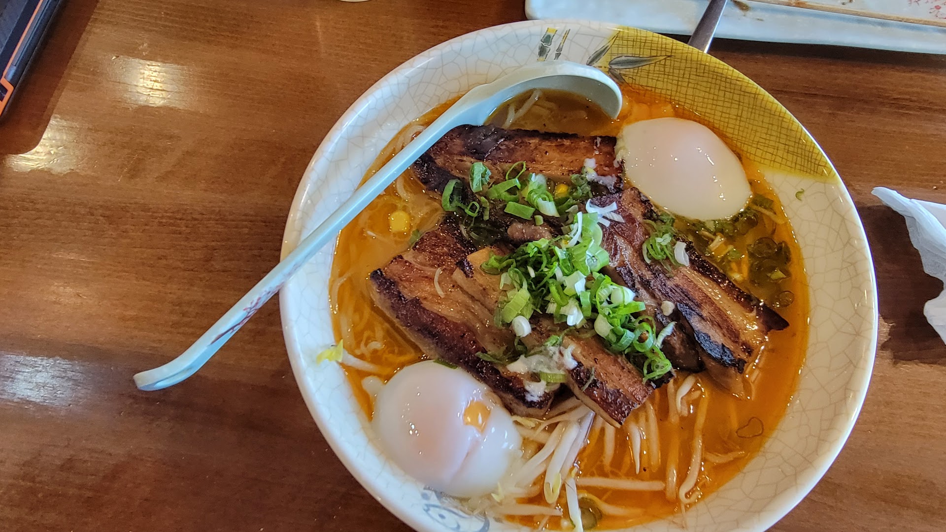 The smoked pork miso ramen was rich and hearty, with a wonderfully satisfying depth. While the broth was slightly under-seasoned for my taste, a splash of soy sauce quickly brought it to life. The noodles were perfectly cooked, the pork tender, and the added soft-boiled egg was a luxurious touch. I appreciated the subtle heat in the broth, which added complexity without overwhelming the dish. The portion size was generous and comforting—just what one hopes for in a satisfying bowl of ramen.