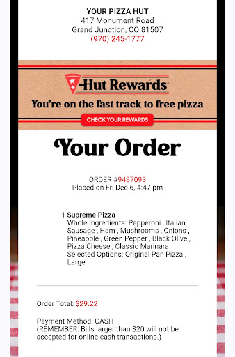 I have ordered from this location since I have moved to grand junction Colorado and up till tonight May 5 2017 I have been happy with them but I put an order in tonight and about an hour or so went by so I called to ask if they was going to make it and the night manager was straight up rude and mouthy to the point me myself lost my temper with him and I am a very laid back person hardly ever get upset almost never but this night manager pushed my buttons just right he is by no means manger material I ran a shop of 37 men for 17 years and if I had ever acted like this guy I would of been fired on the spot I just ordered from this location just the day before an spent $40 dollars then the next day im spoke to like this when I only called to see if they were going to make it cause it was coming up on the closing time he said that they knocked and knocked on my door and no way that happened because I was sitting right beside it he said they call and I see that they did but my phone had died an was on charge but was never knocking on me door and he flat out called me a lier and also said we will never serve me again when I just spent $40 the day before this he was rude and belingernt the night manager that was on duty May 5, 2017 needs to be held responsible for his actions and delt with ocordenly this one time being treated as this manger acted with me I will never spend another penny at Pizza hut .this so called manger is no way manager matterial by any standards I am very dissatisfied with Pizza huts choice of putting people like this in positions that deal the the public shame on Huts management choice I guess with this kind of manager he's Always right and the customer is nothing so thanks Pizza hut . Domino's was glad to take my order and deliver it faster than hut ever did so I guess thank you pizza hut manger u open my eyes to alot better customer service any day...