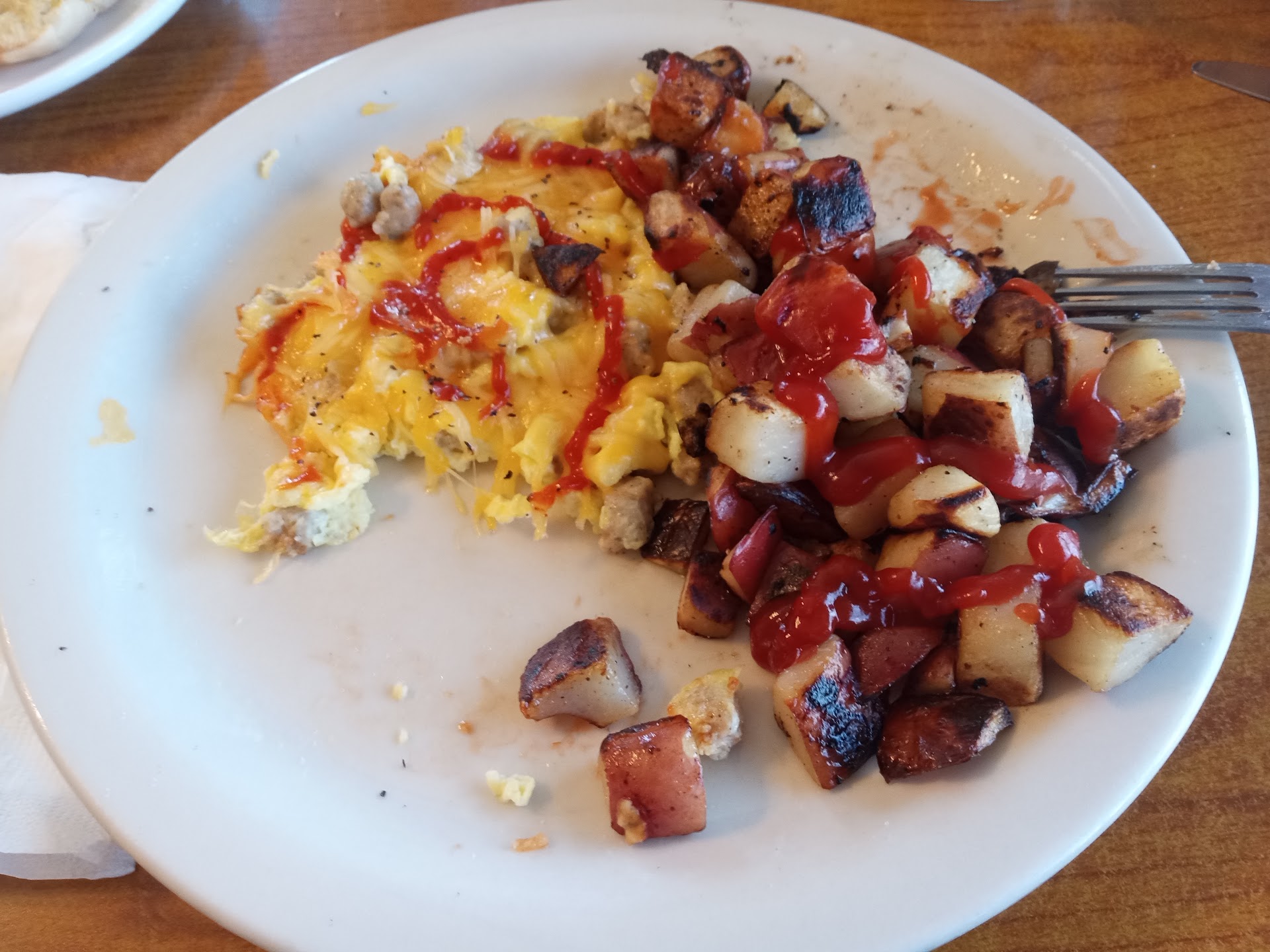 By the way you are charging us the consumers a surcharge on eggs ,as a result we the consumers are cancelling the tips to the waitresses to make room for your surcharge on the eggs, .......Well, I had breakfast at this Restaurant about a week ago and the experience was so so, I ordered scrambled eggs and sausage, scrambled together, the breakfast comes with what the restaurant calls house potatoes cut in bite bites also included , English muffins. If you ordered coffee be ready to fork more than,what it's worth , but if you are a coffee drinker you will get your money's worth , although the coffee tastes cheap very close to chicory. When the food arrived, the presentation was horrible, the eggs and the sausage looked like vomit and the potatoes were way too much for a person to eat and seem undercooked, but they're tasty and with a little ketchup we're ok, the eggs and sausage looked like a mess not what you expect what you see in the picture is how I left it, just eat a few potatoes and drank 3 cups of coffee and drove to Burger king for the breakfast platter, way better than Randy's and price wise Randys almost $20.00. Burger King. $7.99 and BK presentation was good. Price was bad at Randy's way too expensive for the quality of food you get. And I think the prices are higher because the Restaurant had to pay their staff more and for this the consumer pays more and the restaurant still makes the same profit so, the wait staff will get less tips than before because of the price rates. I will give this restaurant a 6 out 10 food presentation bad, service was great, the waitress was very cordial and keeps checking on you. The atmosphere was ok. If you're on a budget I will not recommend this restaurant, it will fail to meet your expectations, try Denny's you will appreciate this recommendation. ...