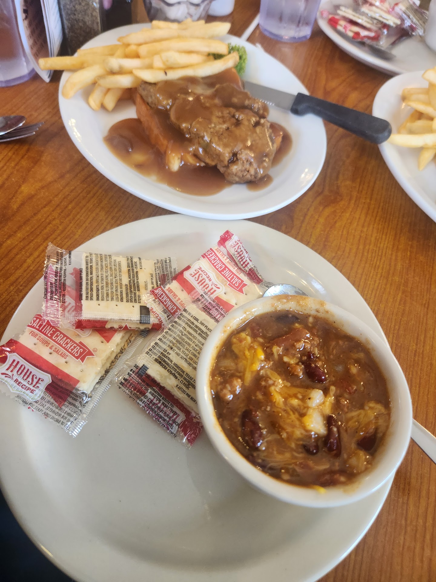 That aside we decided to try it anyway. The sign says "please seat yourself" so we did and then waited 10 mins to even be greeted or brought menus. Another 10 minutes for our drinks (2 waters, a small chocolate milk and a Sprite) and then we were ignored completely for the next 40 minutes while waiting for our food. My husband finally had to get up to ask what was going on with our food and then it was brought out with an excuse from the server that my husband's plate had to be remade because the cook put cheese on it when he had ordered no cheese.