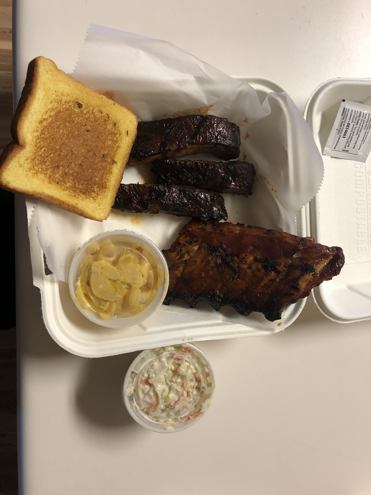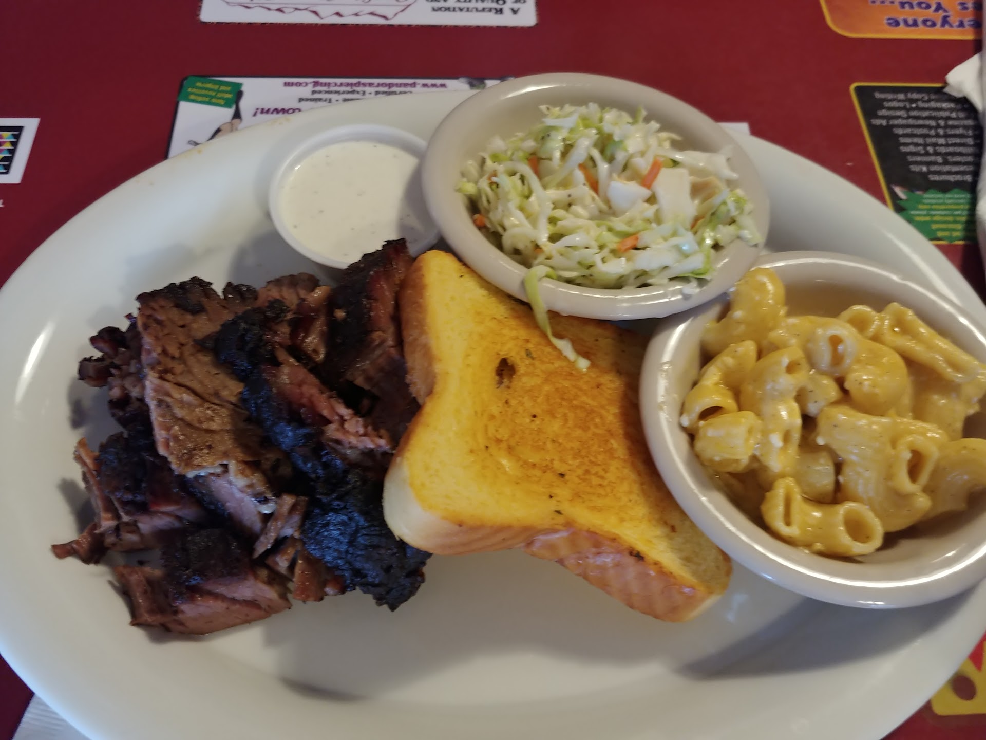Ā Ā Ā Read moreWe ordered two meals: two meat dinner (ribs, 4: good flavor, not as freshly made as some we have had; & pulled pork,4.5) with side potato salad, 5 (loved the mix of potato with some of the skin still on, creamy base, very delish and freshly made) and a side salad with ranch dressing. Second meal was a smoked beef sandwich, 5 (Texas toast for the bread, healthy amount of sliced beef, with a sauce of horseradish/ranch on the side- had to ask for it, Yum!) with a side salad with blue cheese, 5. The side salads were very good with 3-4 grape tomatoes, 2 sliced cucumbers, shredded carrots, fresh mixed lettuce, and the dressings were home made quality, large chunks of blue cheese. Tables were clean with prompt table cleaning by bus service, waitress service was prompt, and food quality excellent. Only recommendation is to clean or check floors when cleaning tables, and please thoroughly wipe down all sauce bottles; BBQ is messy and itās very unclean to have sticky bottles with last guest chunks on the bottle. We will definitely return. Easy to share a meal in order to save room for a dessert. We thought prices were reasonable with...