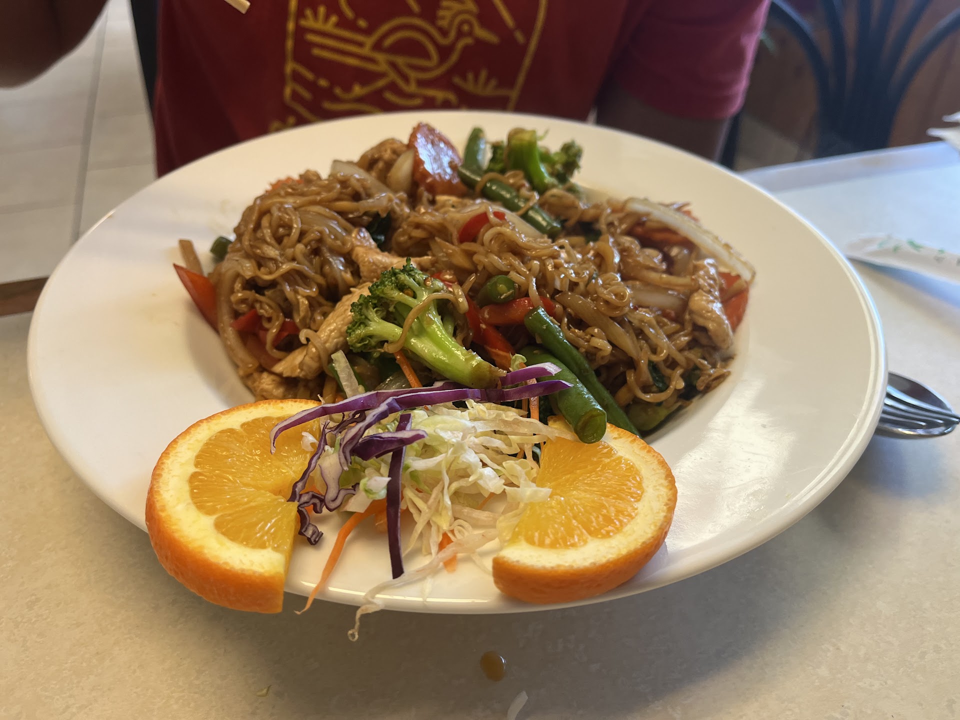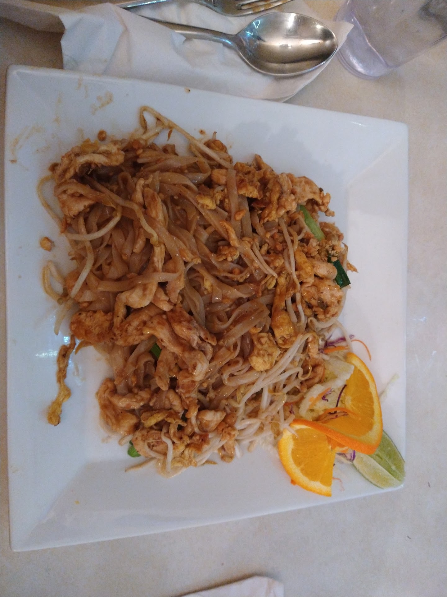 My husband, who likes things hot, found that his Massaman Curry dish was spicy enough for him with the Thai Spicy level which is the hottest you can do. Our friends also found the spicy levels appropriate. One ordered the Pad Thai Noodle dish Hot and the other ordered it Medium+. Both liked the level of spice they had.