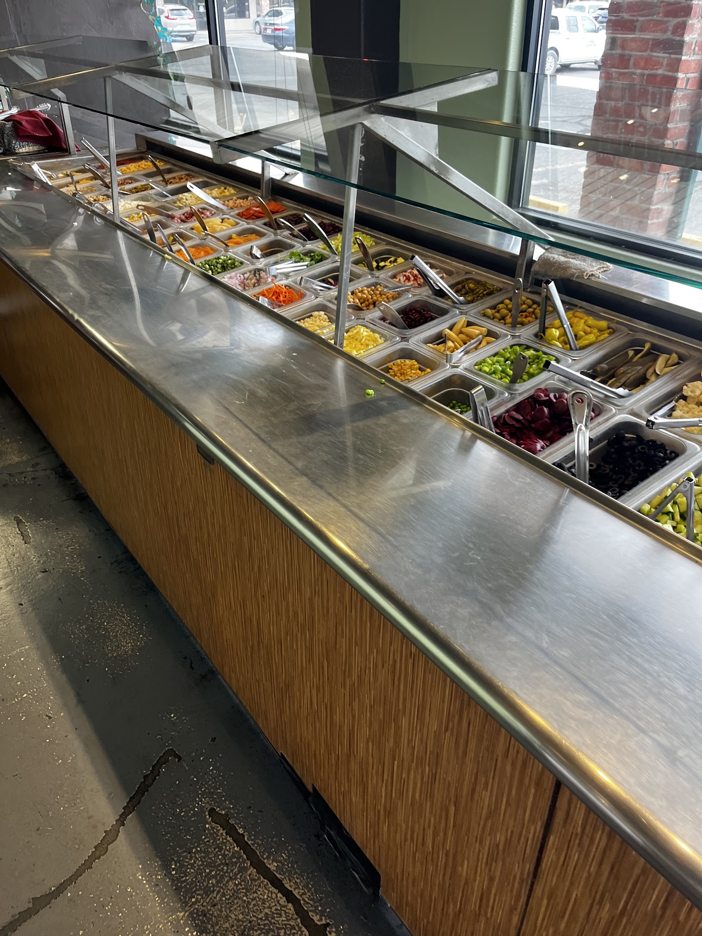 If you can find a place to park, (this establishment is next to a very popular resturant) once you enter, you are promptly hit with a wave of heat. I visited in August and it was cooler outside in the noon hour than it was in the dining area inside. You look at the menu and ask yourself why you are paying so much for a one trip salad bar. You can have a sandwich, but that will take 20 minutes of waiting, (did I mention how hot it is in there). I did not try any of the soup as IT IS HOT in the establishment. Reading other reviews indicates that the temperature is not an isolated incident. After your 20 minutes of waiting for your sandwich elapses, your sandwich will be delivered to your seating area. Just a sandwich. Mine was said to be a "large" bit was simply just sandwich bread but you get two pieces cut in half. I am not sure of they burn every one's sandwich, or if the heat in the dining area burned the bread in the time it took to walk it to my table, (it is HOT in the there).