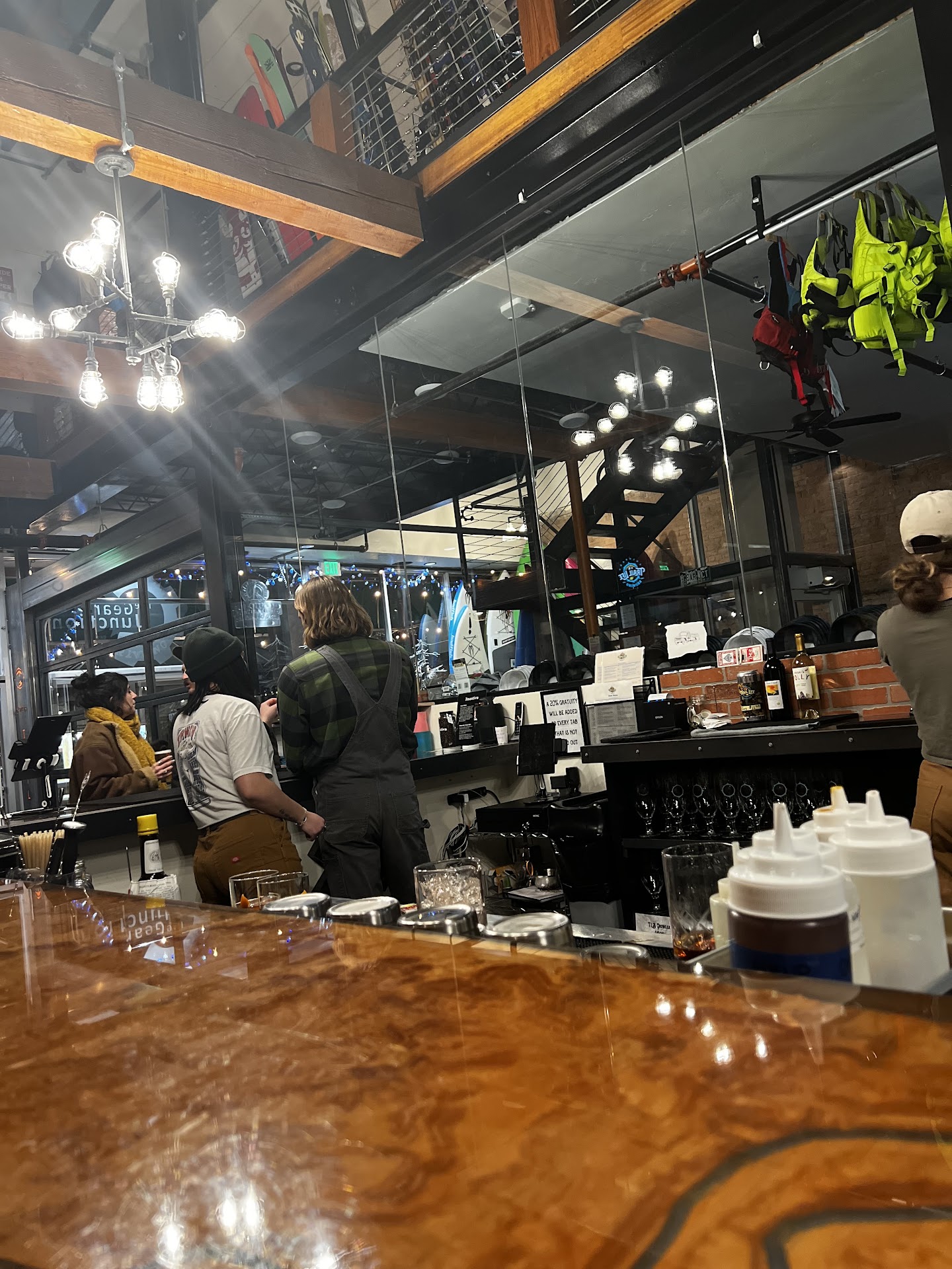 The place is a long narrow room with an overlarge bar blocking the front and compressing everyone. Lights from the adjoining retail shop cast harsh shadows and make you feel like someone might interrogate you shortly. The bar itself is a beautiful piece of resin covered topographic sculpture but it’s too wide and there is additional bar equipment on the inside so the bartenders can’t reach across the bar. In this case the distance felt good because they were putting off enough negative energy to power a Marvel villain. The noise was cacophonous with high ceilings and echoes everywhere. It took the normal jovial noises of patrons and amplified everything until it hurt the ears.