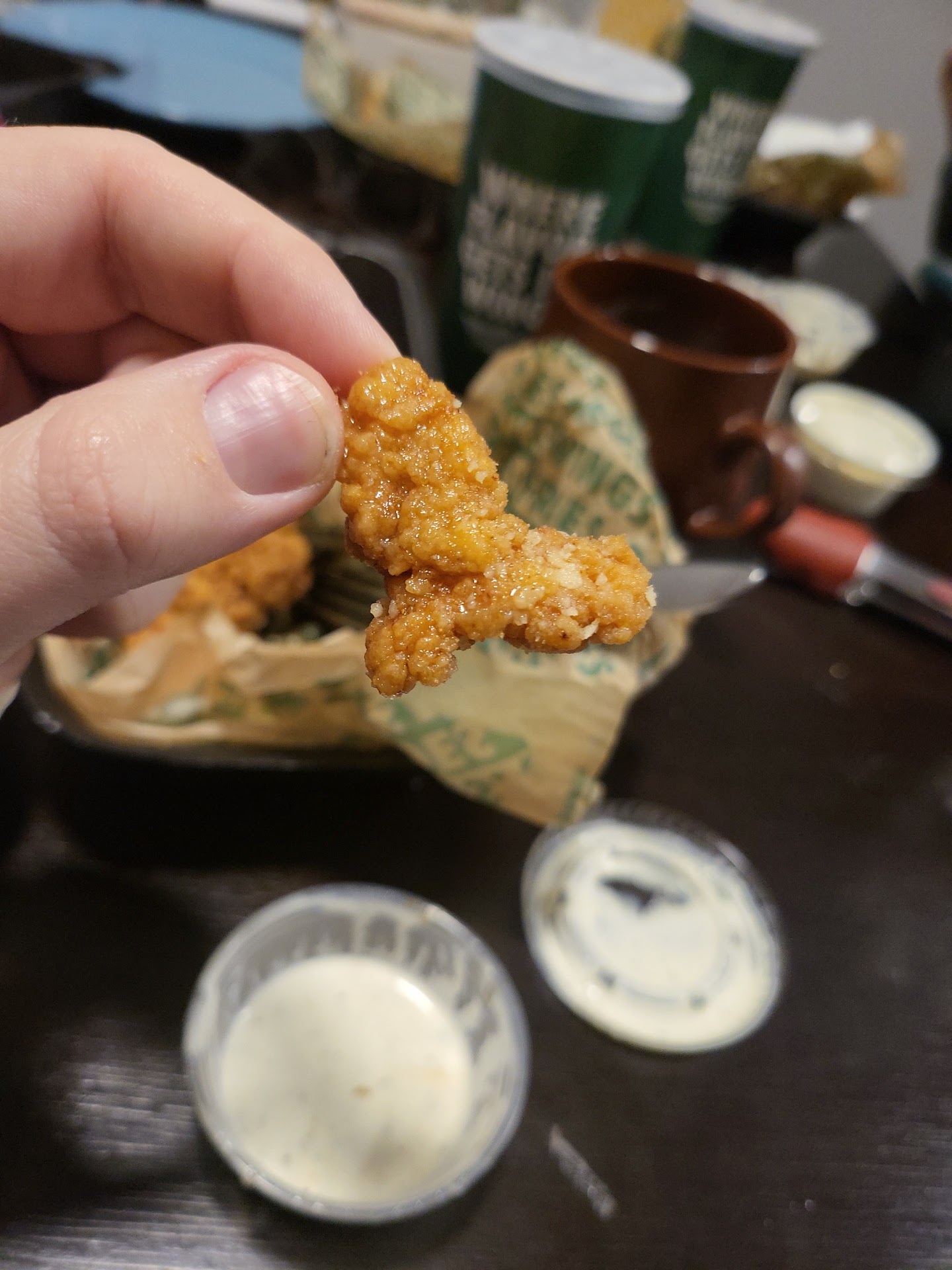 The taste also wasn't anything spectacular. The ranch is the only redeeming quality of Wingstop. I tried original hot, lemon pepper, garlic Parmesan and Korean BBQ. The original hot is just Frank's hot sauce. Lemon pepper tasted very sweet like lemon frosting you'd find on a cookie - maybe they left out the pepper? Garlic Parmesan was good but just basically turned to butter by the time we got home. Korean BBQ was great but the wings were way over sauced, which I never normally complain about, but that side was VERY strong :P