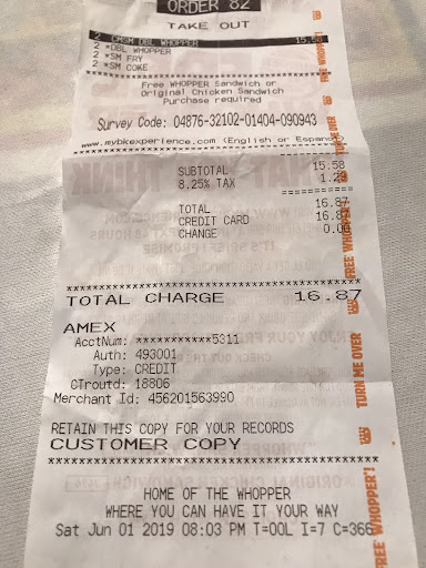 What a dumpster fire of an establishment. I ordered 2, $6-double whopper meals and the total came out to $15.58 BEFORE taxes. I literally pointed to the value menu at the $6 double whopper meal and the dunce at the register still had a difficult time receiving and understanding my simple order. Now Iām no rocket scientist, but the last time I checked, 6 + 6 does not equal $15.58 ($16.87 after taxes). No coffee or ice for the fountain drinks either, but that didnāt surprise me. Theyāre always āoutā of something and one machine or another is always āout of order.ā On top of all this, once I got the burger and opened it, I noticed that the hamburger patties were pink around the edges. Iām perfectly fine with some pink in the center, but pink around the edges is entirely unacceptable. The patties didnāt look anything close to āflame grilledā as Burger King advertises them. Also, notice on the receipt it says āSaturday.ā On Saturdays and Sundays, this location is supposedly open 24 hours, except that right after I walked in at 8pm, the shift manager, if you can even call him that, locked the doors and proceeded to tell everyone who tried to walk in after that they were closed and to use the drive-through. This one location has severely tainted my view of Burger King and will be sticking to Whataburger in the future. It would be better for business if Burger King just scrapped this location or at least fired the management and retrained the employees. Iām beside myself at how horribly this place is managed and ran. If you really hate your job so much that you canāt even meet bare minimum operating standards for a fast food establishment, then you shouldāve tried harder in...