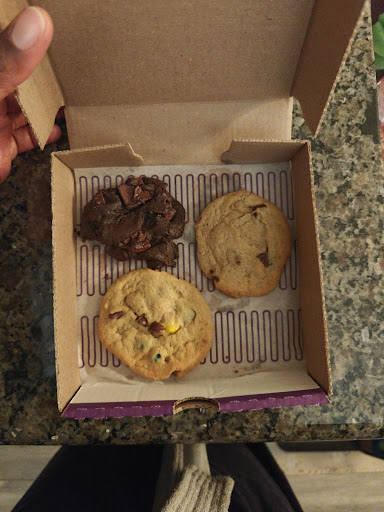 First let me say I know how hard the service industry is, we have all been there working that late shift all by yourself. This location however seems to be always understaffed. Went last night with my wife and ordered six cookies. The person working there was all by their selves and there was a line that took 10 minutes to get through. When we left, I knew i should have checked the box because when we got home, one of our $5 cookies was missing. Receipt showed I paid for it, it never made it into the box. Besides that, the warm and gooey cookies you expect to get seemed to be absent in this batch as every cookie was dry, brittle, and extremely cold. Go to the location in downtown Arlington, they seem to be much more put together over there.