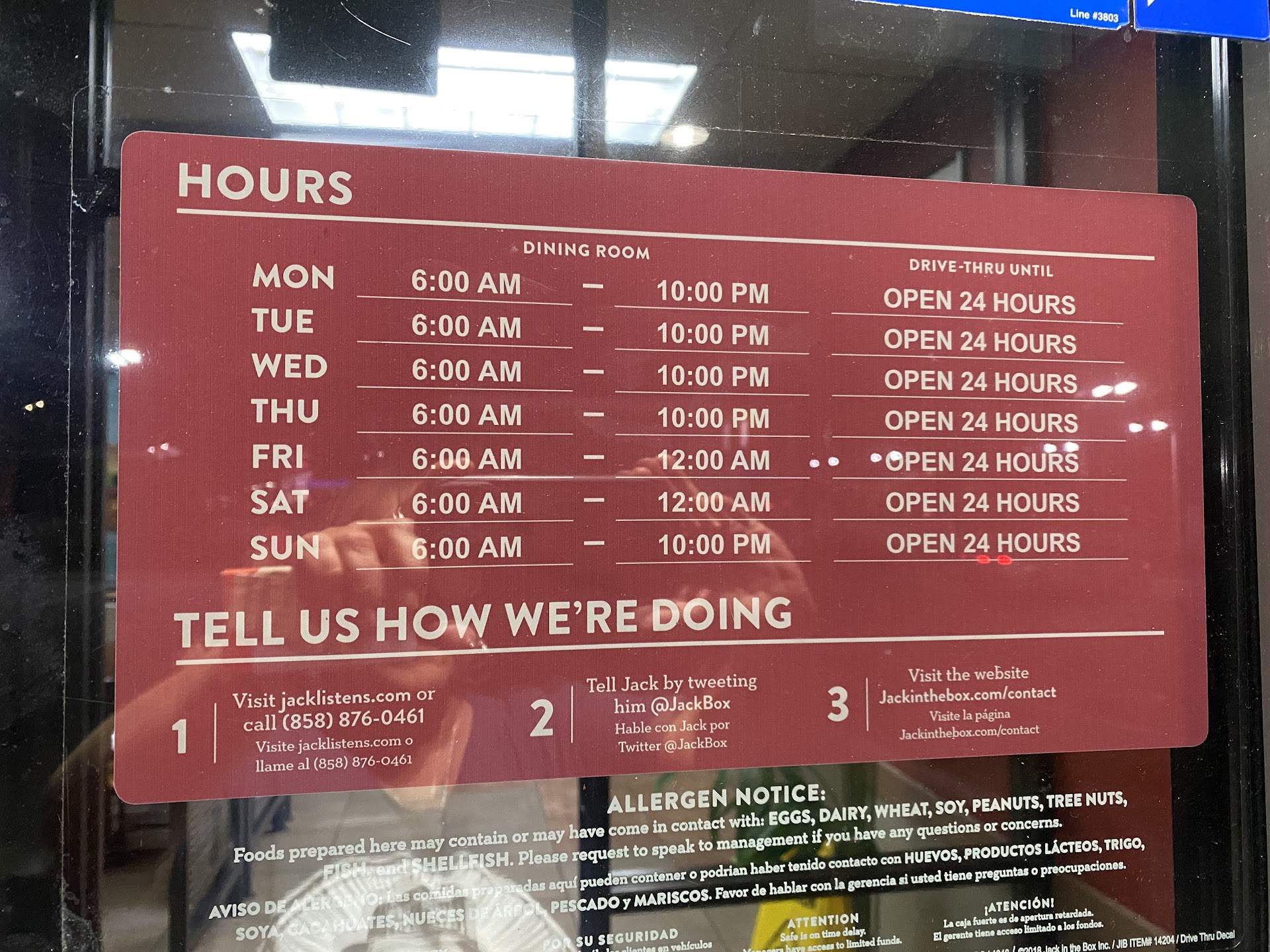 Read moreI rarely give reviews BUT if I could give negative stars I would!!! Called to complain and was told there's no manager til 7am and the woman talking to me about my compliant says "f%*÷k you b%÷/ch" to me!!! Will NEVER go to this location again!! That's such rude and offensive language from someone in public service!! I will be in the restaurant at 7am tomorrow when the manager will be there. Called back and asked for corporate number and got the run around. I can't believe I could not get the number. When I asked for her name I was told "I can't give that to you, she's just a team leader". Worst Jack in the Box EVER!!!!!!!!!!!!!!!!!!!!! I went back up and into the dining room and at counter asked about/for this person...the young woman with black n red long hair came to the counter and when I asked if she was the one who said "FU B" to me...her 1st response was "can we step outside"... If you said NOTHING to be ashamed of why would you EVER say this??? And why would ANYONE say this working with the public?? AND when I wouldn't she made a spectacle. She knows she said this to me but because she acknowledged she spoke to me on the phone... On their cameras...and then twisted things when I would not "go outside" thinks she protected herself. NO CUSTOMER WHO WAS NOT SPOKEN TO LIKE THAT WOULD GO IN TO SEE WHO SAID IT IF NOT TRUE!!! She proceeded to twist words and threatened to call the police on me. I left knowing their cameras and corporate office will...
