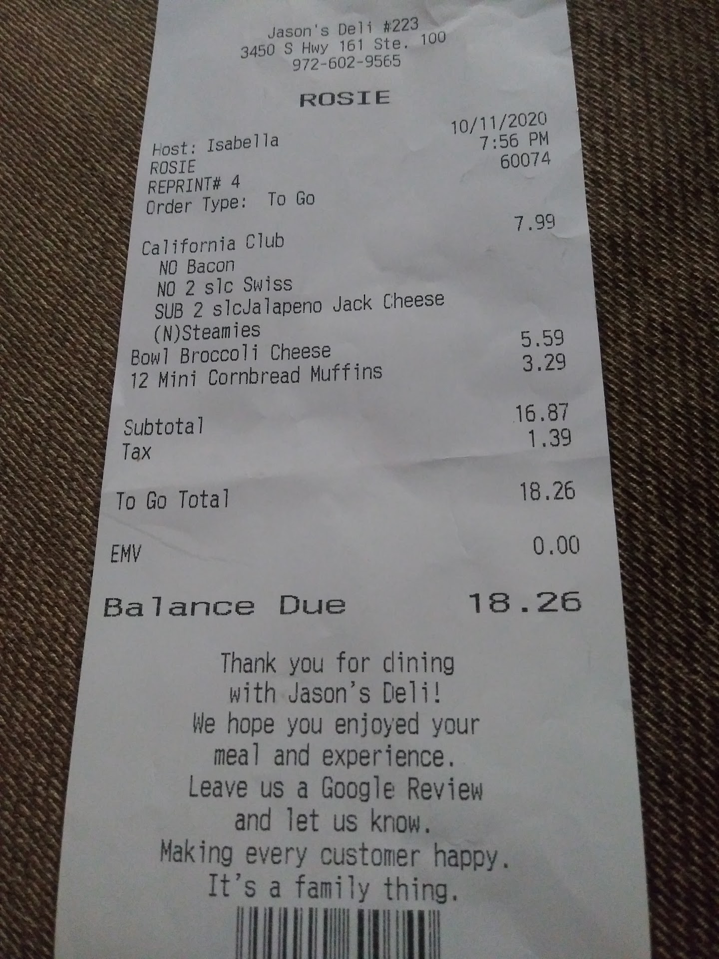 Read moreI’ve been to the location a couple times for dinner since it opened I love Jason’s Deli and was beyond excited when they opened this location close to my home. However this week I went for dinner there on Tuesday with my 19 month old son the young girls VERY friendly offering my son a color sheet and conversations with him and were approached by a “trainer” and told to stop chit chatting with my son and get to work. (And not in a nice tone) I didn’t say anything at first but then as I was ordering she continued to interrupt me telling the young lady who was taking my order that she was doing it wrong (in an annoyed tone) I finally asked her to let me finish ordering and stop being rude to the young lady she stepped away and another trainer came to assist he was just as rude and proceeded to inform the young lady she was entering order wrong then realized that she was right because I’d asked for the sandwich a certain way. He didn’t apologize to her instead walked away to tell another group of girls they were wrong smh. The staff isn’t the problem at this location the trainers are. Hopefully they won’t be at this location long because they are going to drive away customers with...