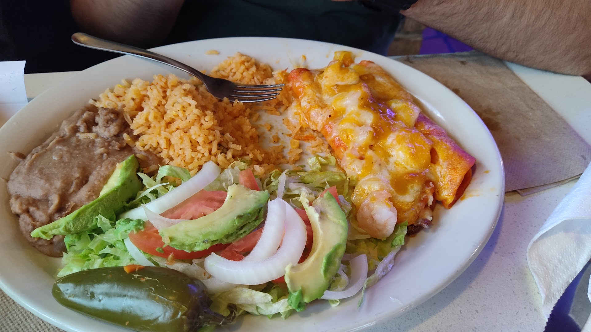 Read moreI think this place doesn't get enough traffic for lunch. The food was cooked fresh and served hot. This is my 3rd time to eat food from here as to-go food. Today we went inside to eat. The place is clean, chips and sauce were good. We ordered chicken fajitas, rice and beans. Chicken was tender and good seasoning. The next order was beef fajitas nachos 1/2 order. Beef was good, but tough on a few pieces. Seasonings were good. The quantity of food was more than enough. I drank tea and we had water. The bill was $24 for lunch for 2. They do have a small bar with seating. The place was clean. It showed to have a comedy club up stairs. They also have a sign for banquet...