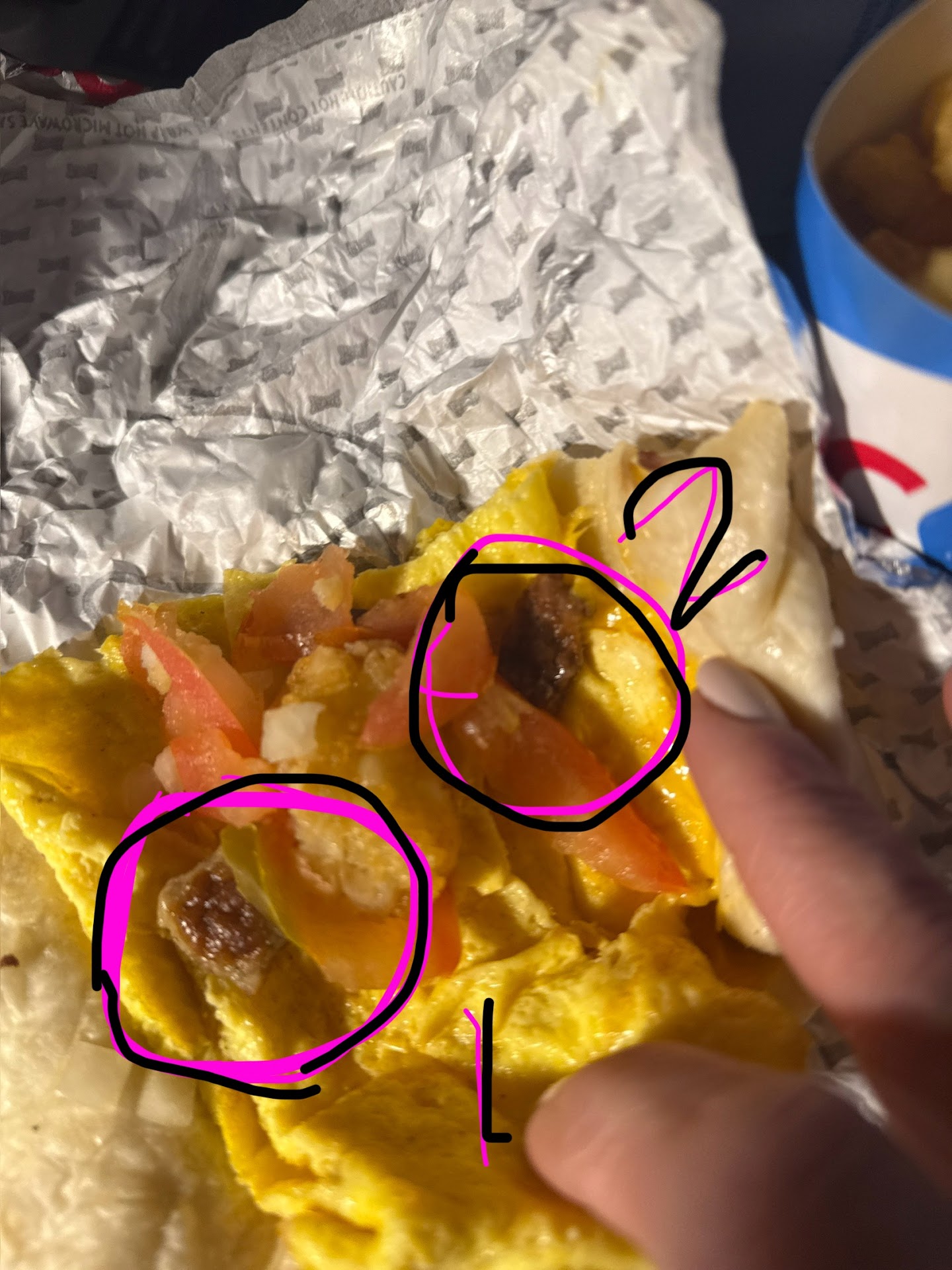 This is an add-on to my review. The one part of my meal that I could salvage was my shake. Unfortunately, I found this in the bottom of the cup when I was almost finished with the shake.
