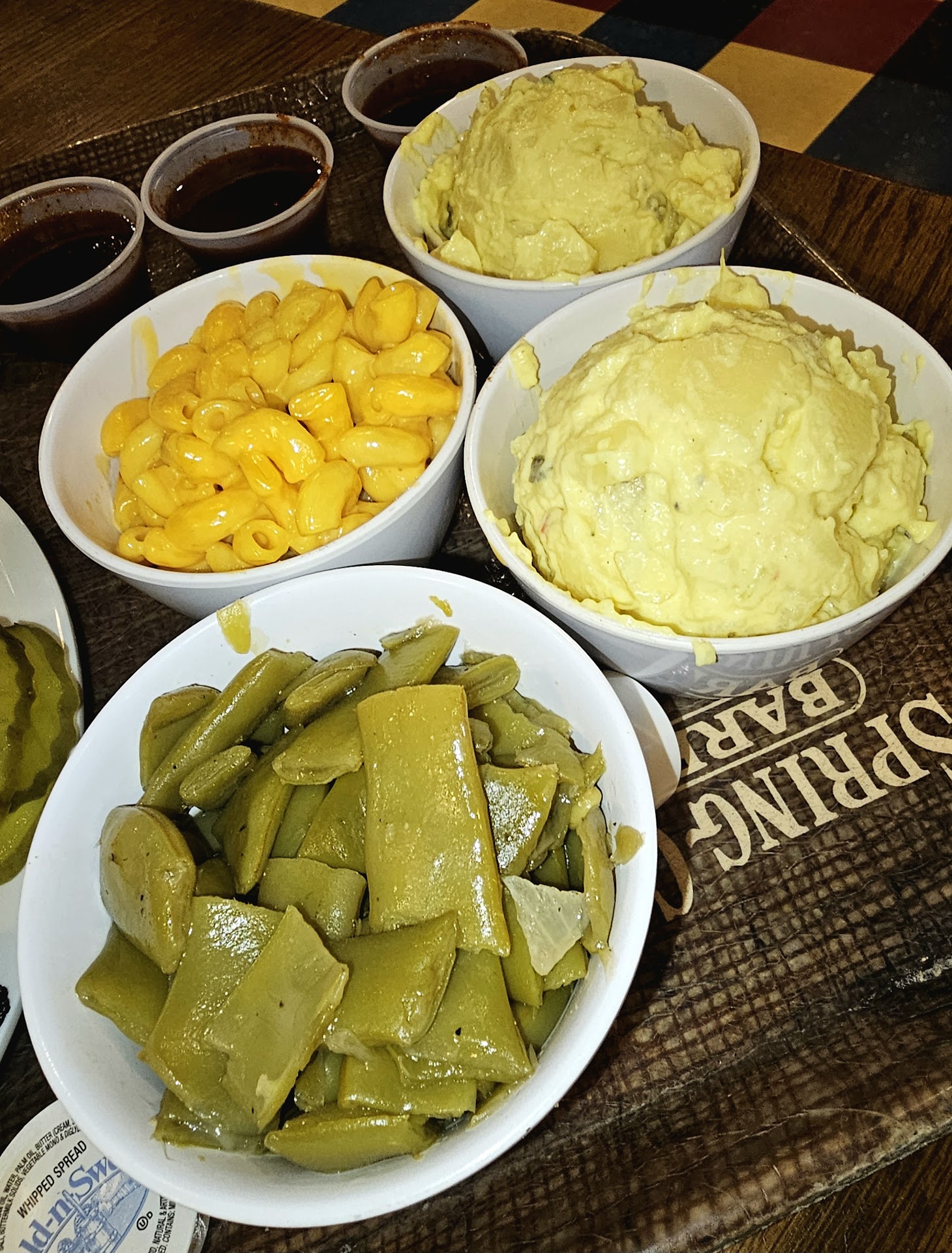 Sides include things like potato salad, cole slaw, corn on the cob, green beans, various pickled peppers, dill pickles and sliced onions. You can order baked potatoes and salads too either as a main course or a premium side. Not to sure about that since I stick to the basic program.