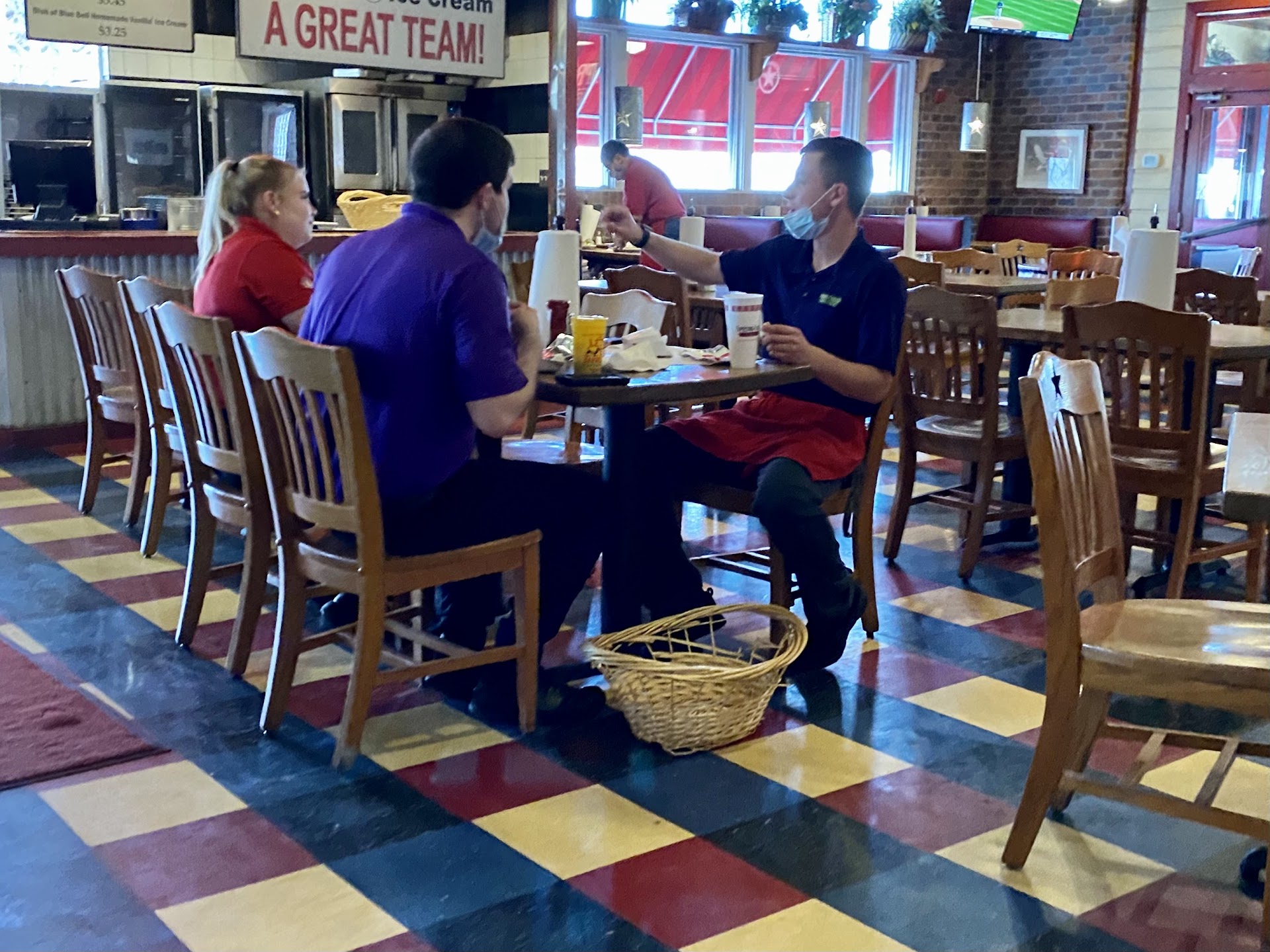Today we came with the whole work crew. (+$100 ticket). The African American gentlemen would not only chop the meat, plate it, and bag it but he would also hand it out. The bus boy kept busy with the tables, but they were the only two actually working. When we ordered, the employees, pictured sitting down, rushed to the line to help us, however they got our order wrong and they were not listening or paying attention. We saw their attitude and work ethic and figured it wasn’t worth arguing or making a big deal about it. We wanted two meat combos instead only got lukewarm brisket. They didn’t have a baked potato available which is my preferred side that I couldn’t get because they were out. After “helping us” They sat down and talked and joked around. At first I thought they were on break. However, they would get up only to ring someone up, so they had to be on the clock. 20 minutes after we sat down; being more than half way done with my lukewarm meal. I realized we had gone without any hot bread being offered, had to us. I had to ask one of them for fresh bread. Although I wasn’t sure he heard me because he didn’t nod or so much look in my direction after I asked for bread. Keep in mind that is something that Spring Creek is know for. Other times, a Hispanic lady, at this location, would ask us 6 or more times if we wanted bread. She would continually be making and handing out bread; something customers not only enjoy but expect at Spring Creek. Even if we only want one or two rolls it’s nice to know we could get more if we wanted. One of the boys sitting flirting with that blonde threw the bread in the oven only to promptly sit back down. That’s how I figured he had in fact heard me ask foe the bread. When we finally were given our bread(employee not wearing gloves) it was both burnt and undercooked: Squishy, gooey middle and burnt, crisp outside. The worst part is how they treated the bread basket. They hung it on the back of a chair that they were sitting in. Only to be moved to the floor as shown in the picture. After some time they just place in on the counter by the oven where it always is without so much as a wipe down. I don’t know if that is against health code, but I know I wouldn’t want to eat anything out of that basket or anything prepared on that counter.