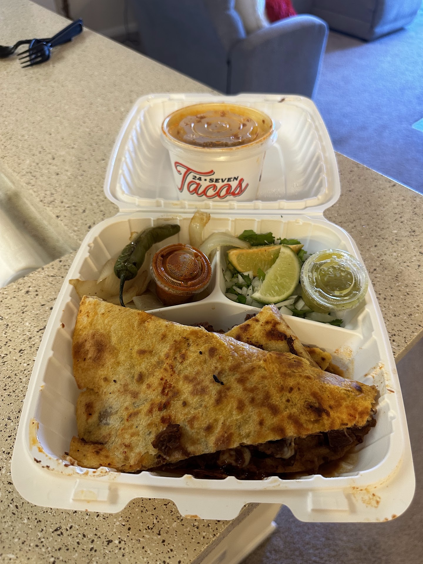 The first time had this was through Door dash and it was delicious! I decided to drive there this time since it was so close by and it was in the back of the Chevron. Cool, those are some of the best taco places attached to gas stations. But, it was only me, the guy running it and a cashier for the gas station in there at this time. I stood there for ten plus minutes, watching the guy stair down at the register, never looking up. Then a lady cashier that was outside walked up, stepped in front of me with out saying a word or any type of excuse me, started talking to him, he responds, she walks away still not saying anything and he goes back to looking at the register. Finally, he looks up at me and says yeah. I point to the menu taped to the counter and say I would like two orders of these. He looks down, says ok, and then says what? I repeated it at least 4 times, and he finally gets it and rings it up. But only rings up one. I repeat 3 more times, two, you only rung up one, I would like two orders. I am thinking maybe a language barrier. But then I say I do not want the drinks, and he repeats it and says ok, I ask if I can get another type of drink he says no. No problem, I ask if I pay for the other drinks here in the back, he says no up front. So, there is no language barrier. Now for the food, I got the quesdilla birria (sorry for any mis-spelling). But it was mostly fat! I would have rather he say they were out instead of selling me ones full of fat and little actual meat. We ended up throwing it away. I am a texture person, and once I got that second mouth full of fat and cheese, I couldn't stomach it. All this to say, maybe on a better day or earlier before 7, they would have been as good as they were when we ordered through door dash. The consume was as delicious as I remembered it from the first time, though! They are worth a try. Maybe it was this guy's first day or just a bad day. I won't be going back, but they are...