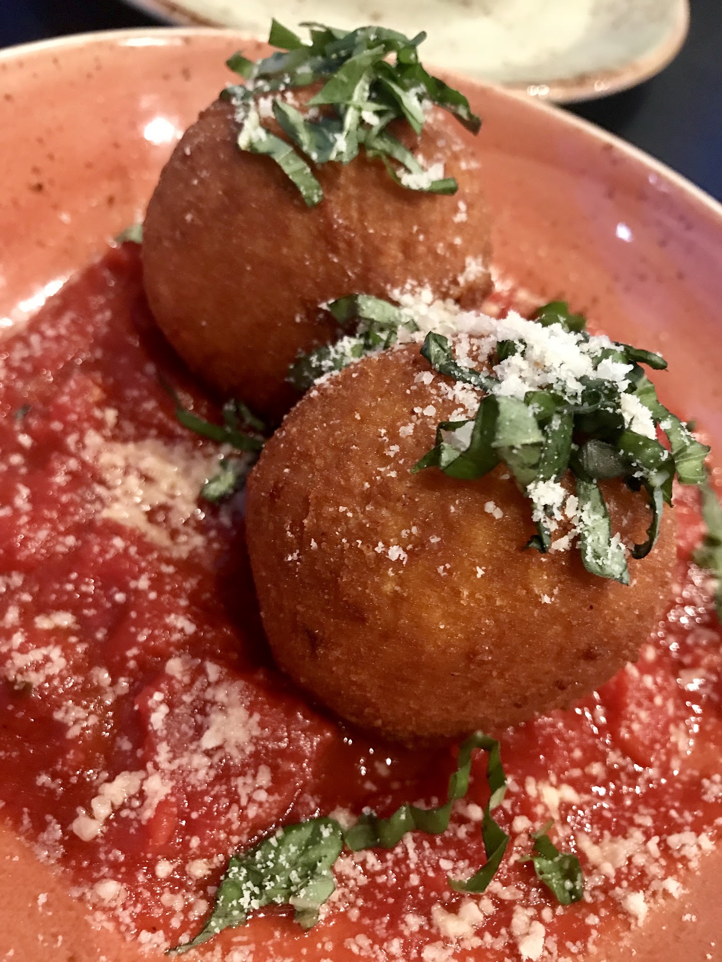 When our waitress reappears with drinks, she asks, “Have you decided on dinner?” What? We’d been told it would be a 30 minute wait and here we were, ordering after only 10 minutes! Excitedly, we get the Arancinis, crispy rice balls filled with meat sauce and mozzerella. They are beautifully composed and a perfectly crispy, gooey temperature. However, they are also filled with peas, and Juliet hates peas. She gamely picks them out, eating around the green. I really enjoy them, but I feel kind of bad for her. It would have been nice to know ahead of time about the contents of the arancini.
