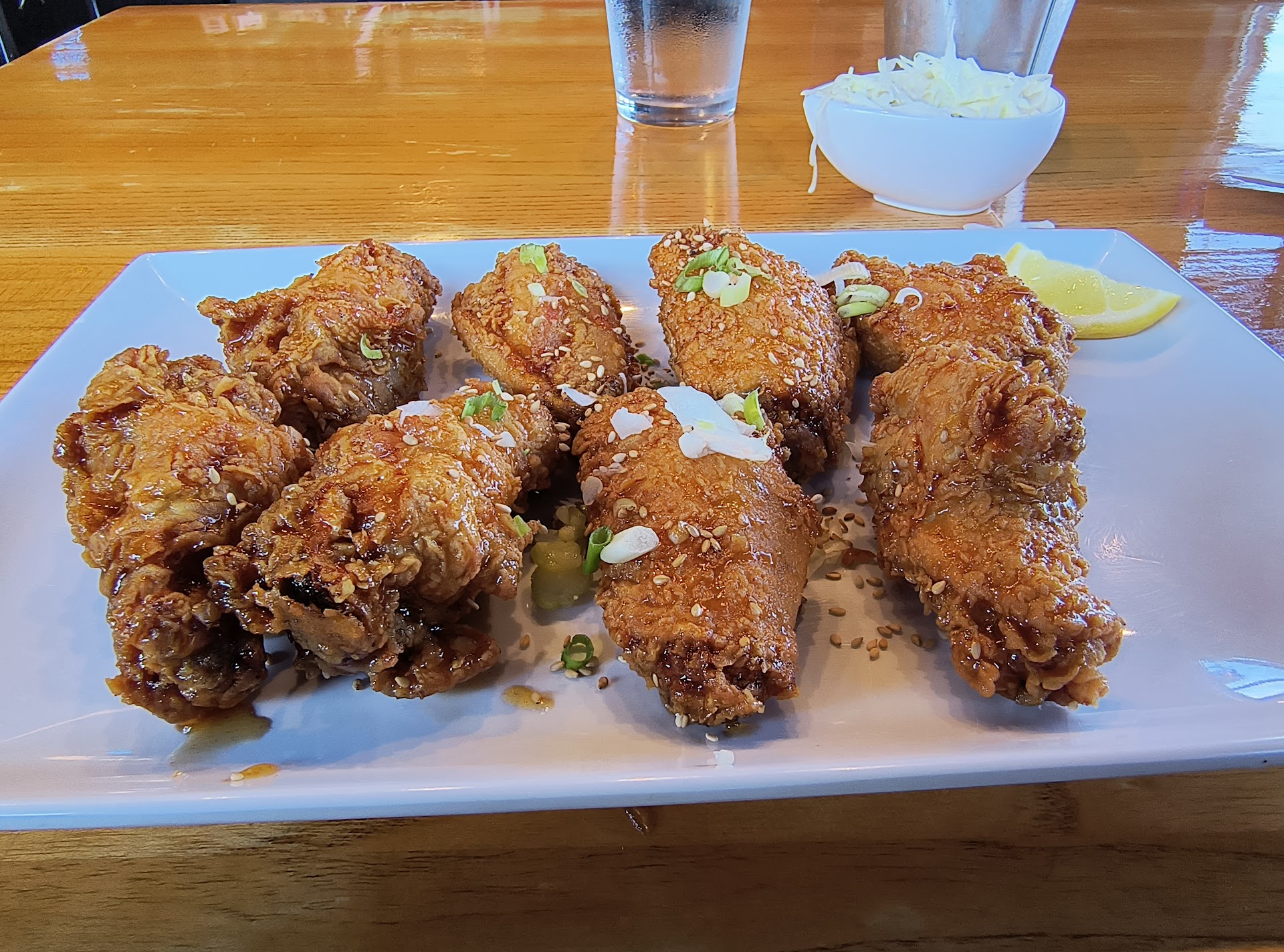 I ordered the Japchae ($12) with beef ($4) and 8pcs Korean Fried Chicken Wings with Garlic Soy sauce ($15).Ā Japchae is glass noodles with assorted vegetables. It was good, but a little bit boring in the taste department. The Wings were cooked very well. Chicken was tender and juicy and came right off the bone. It was nice and crispy like it's supposed to be. The chicken itself tasted very good. To me the issue was the sauce. First it was only drizzled on. Secondly while it's better than okay, it's nowhere near as good/amazing as the sauce at the other korean chicken joint.