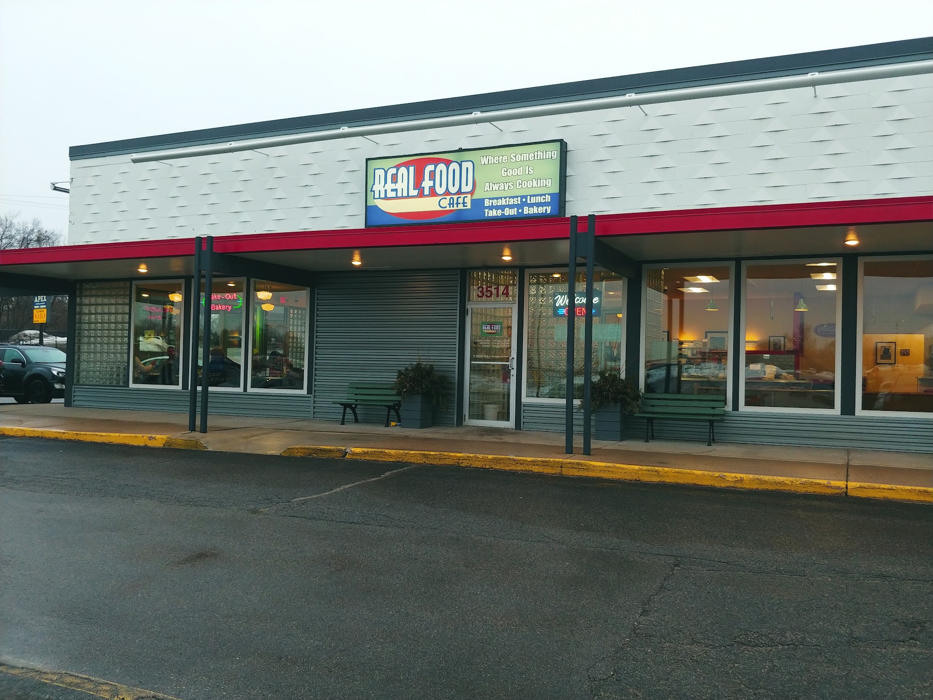 Real Food Cafe is on the corner of Eastern Ave and Alger St in Grand Rapids. It’s a nondescript storefront in a strip mall. There is a parking lot around back, as I find out later; we unwisely park across the street and Juliet has to disembark into a snowbank. So far I’m striking out and our moods aren’t necessarily improved.
